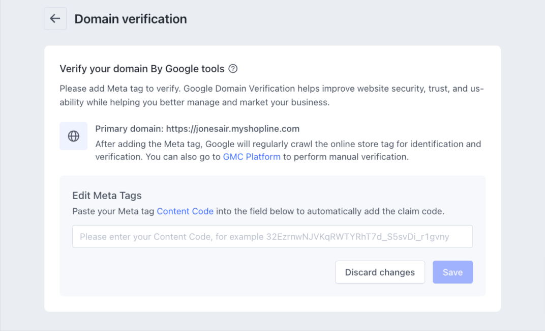 | Ghi chú: Vui lòng không thay đổi tên miền chính của cửa hàng tùy ý. Việc thay đổi tên miền sẽ ảnh hưởng đến việc liên kết GMC và đồng bộ hóa nguồn cấp sản phẩm. Nếu tên miền chính của cửa hàng bạn đã thay đổi, vui lòng truy cập GMC để xác minh lại tên miền kịp thời. Nếu bạn đã có một nguồn cấp sản phẩm đang sử dụng vào thời điểm này, sau khi hoàn tất xác minh tên miền, vui lòng quay lại bảng điều khiển quản trị SHOPLINE, tắt và bật lại công tắc nguồn cấp, và kích hoạt lại cập nhật nguồn cấp. |