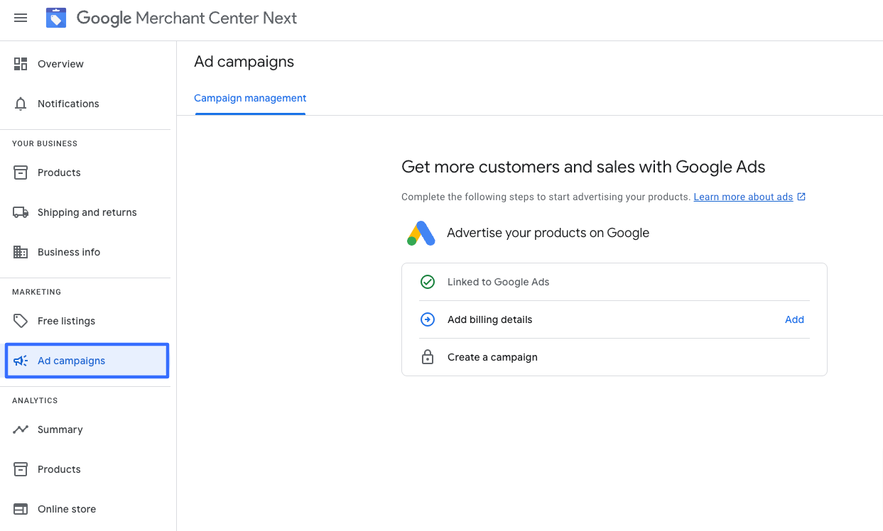 - Truy cập Trung tâm Thương mại Google, nhấp vào Chiến dịch quảng cáo và Kết nối với Google Ads.