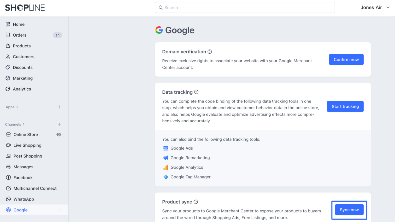 - Nhấp vào Kênh và chọn Google trong thanh công cụ bên trái. Nhập kênh Google và nhấp vào Đồng bộ ngay dưới phần đồng bộ sản phẩm.