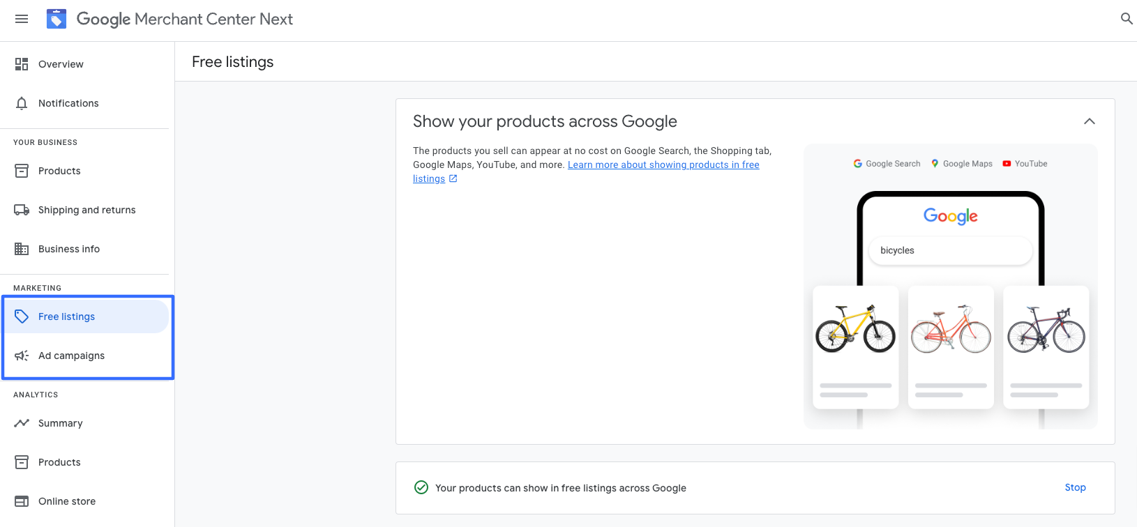 | Ghi chú: Nếu bạn muốn đặt quảng cáo mua sắm trên Google Ads, cần phải đồng bộ sản phẩm của cửa hàng với GMC. |