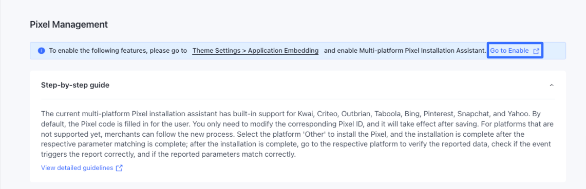 Hiện tại, SHOPLINE hỗ trợ cài đặt Pixel trên các nền tảng mặc định như Bing, Criteo, Kwai, Outbrain, Pinterest, Snapchat, Taboola và Yahoo Pixel. Đối với việc cài đặt trên các nền tảng khác, bạn có thể làm theo hướng dẫn dưới đây: