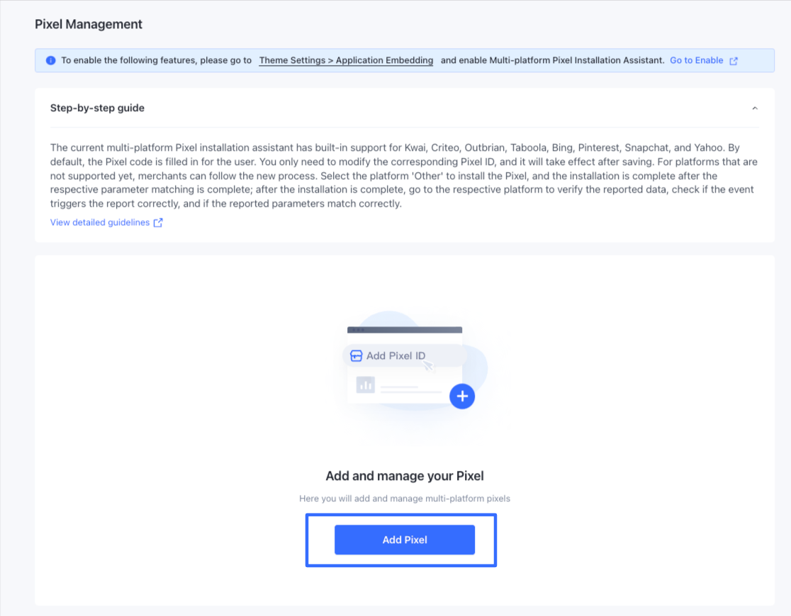 Cài đặt Pixel Đa kênh hỗ trợ cài đặt Pixel theo hướng dẫn trên nhiều kênh quảng cáo chính như Bing, Criteo, Kwai, Outbrian, Pinterest, Snapchat, Taboola và Yahoo, cùng các nền tảng khác.
