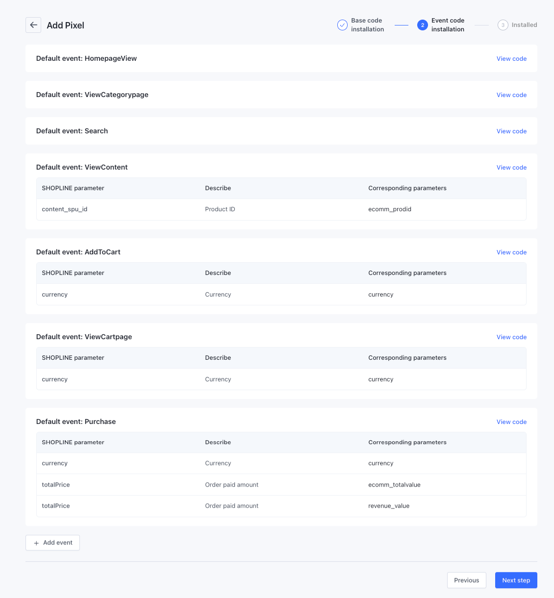 - SHOPLINE cung cấp các sự kiện mặc định cơ bản.