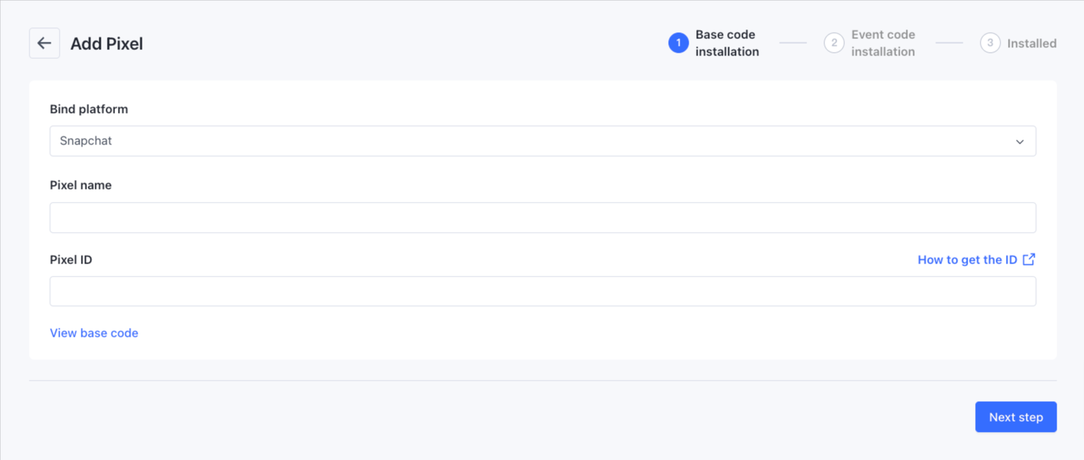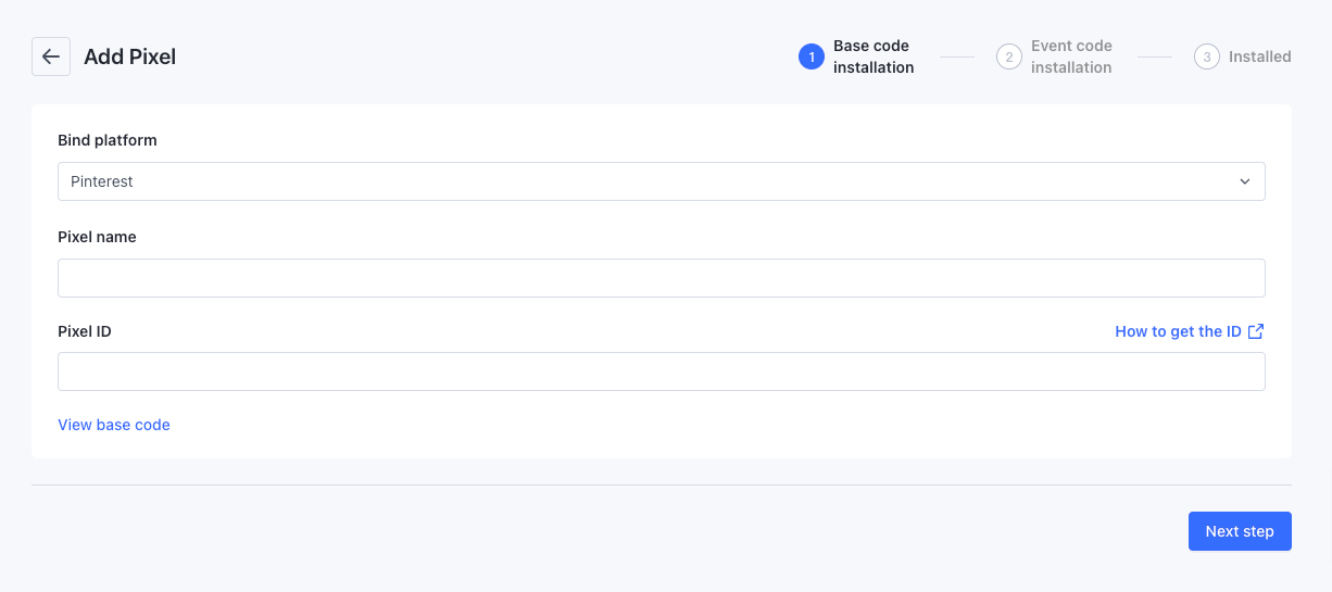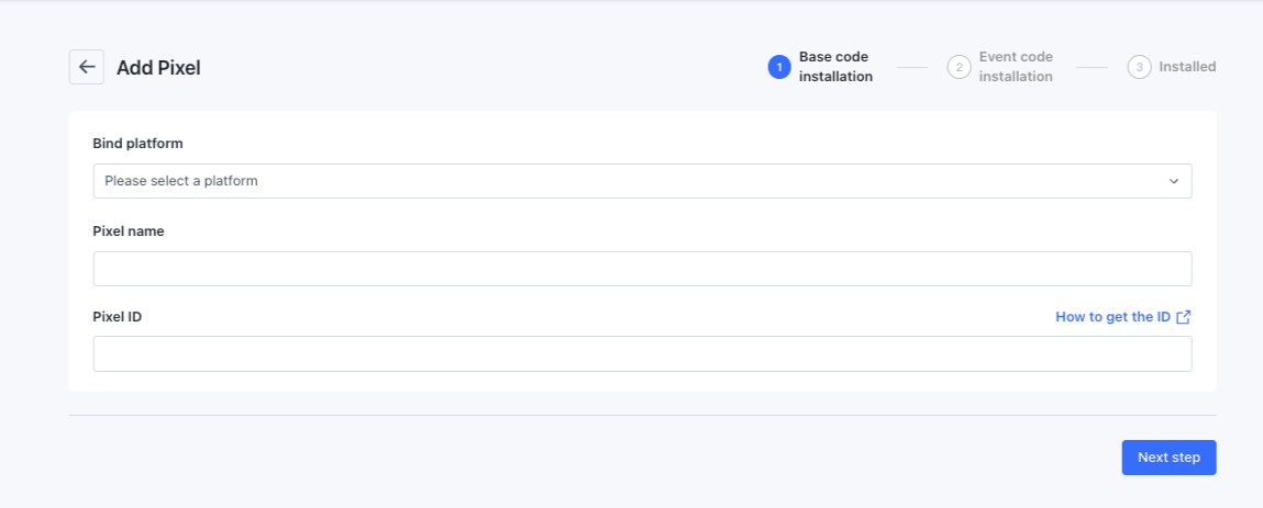 Truy cập nền tảng để lấy Tên Pixel và ID Pixel và nhấp vào Bước Tiếp Theo.