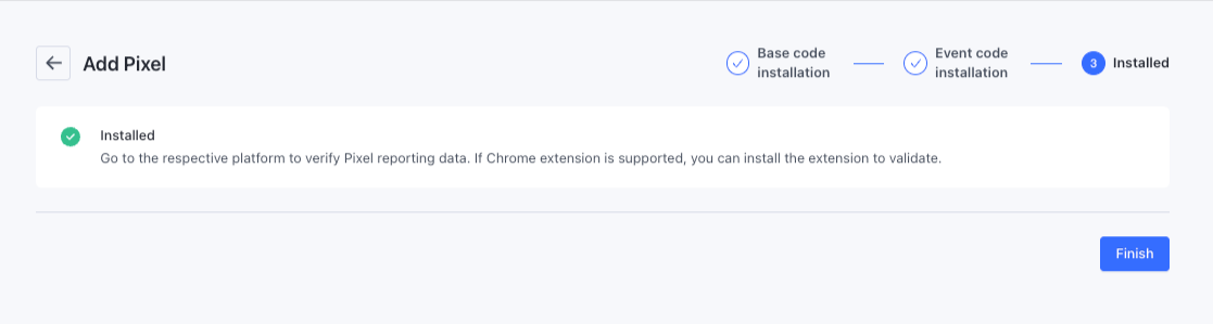 Hoàn tất cài đặt Sau khi hoàn tất cài đặt, nhấp vào Hoàn tất để hoàn thành cài đặt Pixel. Bạn có thể kiểm tra xem việc cài đặt Pixel có bình thường hay không thông qua tiện ích mở rộng Chrome do nền tảng tương ứng cung cấp, hoặc xem trực tiếp dữ liệu đã báo cáo trên nền tảng quảng cáo.