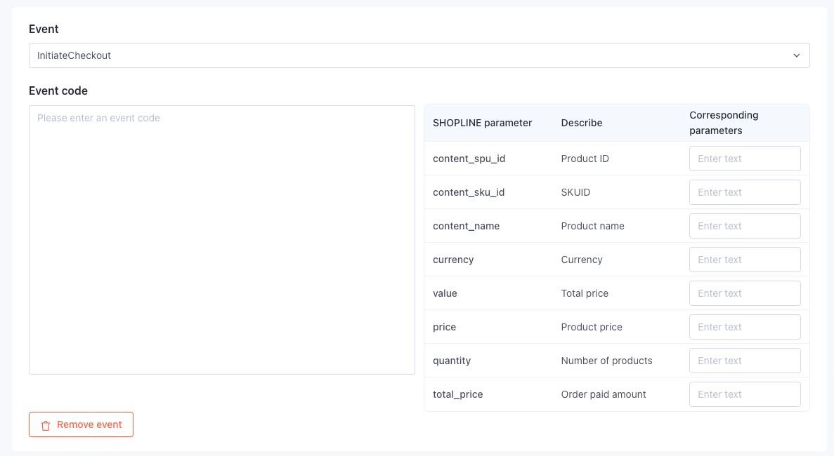 Nếu cần thêm các sự kiện khác, nhấp vào Thêm Sự kiện và điền mã sự kiện và các tham số tương ứng. Đối với việc điền các tham số tương ứng, vui lòng tham khảo mô tả dưới đây: Ví dụ, mã của nền tảng tương ứng là <! -- Mã Pixel Bing --> <script> window.uetq = window.uetq || []; window.uetq.push(‘event’, ‘view_cart_page’, { ‘ecomm_prodid’: PROD_IDS, ‘ecomm_pagetype’: ‘cart’, ‘ecomm_totalvalue’: TOTAL_VALUE, ‘revenue_value’: ‘0’, ‘currency’: “##currency##”, ‘items’: ITEMS } ); </script> <! -- Kết thúc mã Pixel Bing --> Có thể thấy rằng các tham số cần báo cáo bao gồm “ecomm_prodid”, “ecomm_totalvalue”, “revenue_value”, “currency”. Dựa trên ý nghĩa của tham số, điền tương ứng “content_spu_id”, “value”, “price” và “currency”. Như hình dưới đây, các tham số không có trong mã có thể để trống.