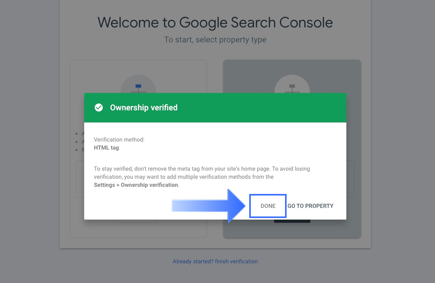 Bạn sẽ thấy cửa sổ Quyền sở hữu đã được xác minh khi trang web của bạn được xác minh thành công. Nhấp vào Hoàn tất để đóng cửa sổ.