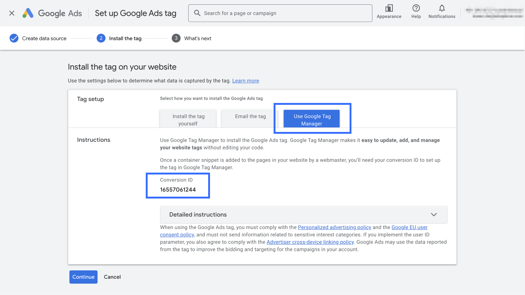 3. Tạo nguồn dữ liệu, và chọn tab Sử dụng Google Tag Manager . Lấy ID chuyển đổi của bạn.