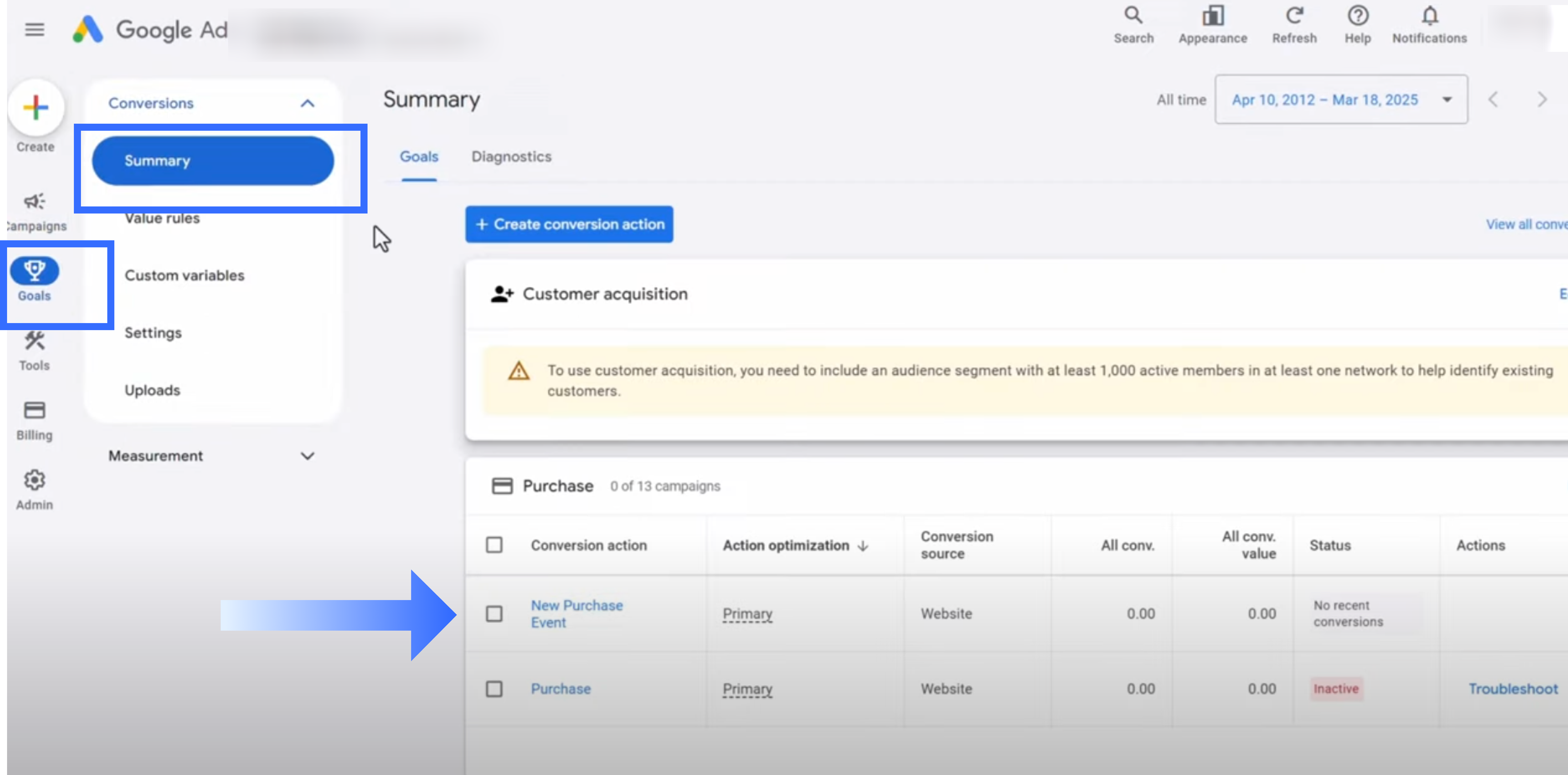 2. Nhấp vào Mục tiêu trong thanh điều hướng bên trái và đi đến Tóm tắt > Hành động chuyển đổi.