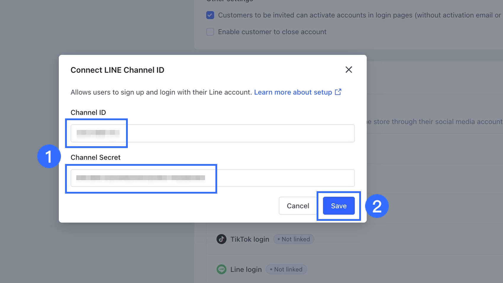 Trong cửa sổ pop-up, nhập ID Kênh và Bí mật Kênh lấy từ Bảng điều khiển Nhà phát triển LINE, sau đó nhấp vào Lưu để hoàn tất việc kích hoạt.