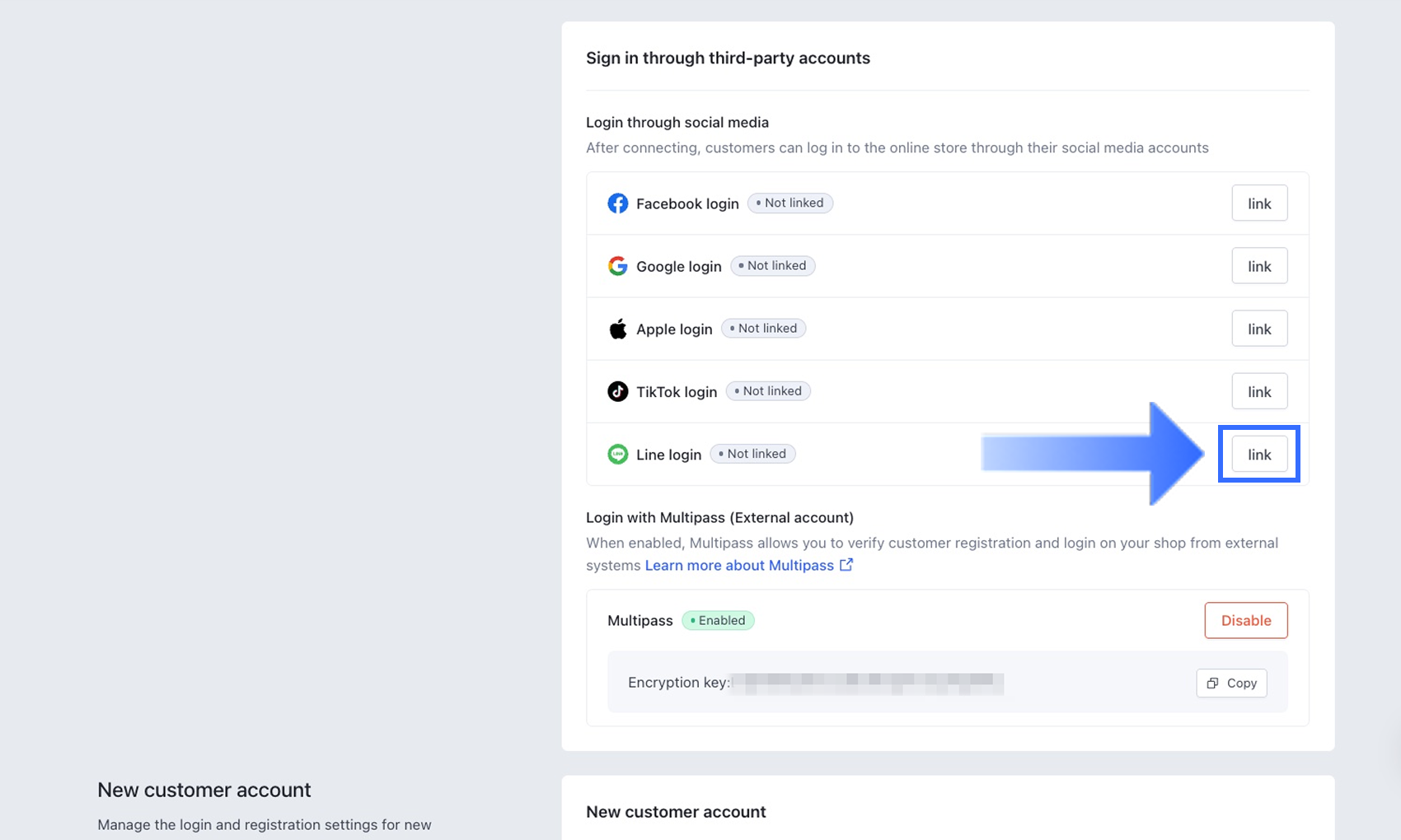 Tùy chọn đăng nhập LINE sẽ hiển thị trạng thái Đã liên kết. Dựa trên nhu cầu kinh doanh của bạn, hãy chọn xem có nên kích hoạt đăng nhập bên thứ ba cho Tài khoản khách hàng Cổ điển, Tài khoản khách hàng Mới, hay cả hai trong phần Loại tài khoản.