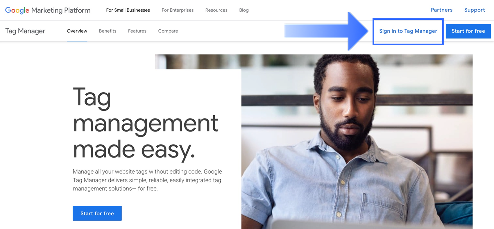 Truy cập Google Tag Manager và đăng nhập bằng tài khoản Google của bạn.