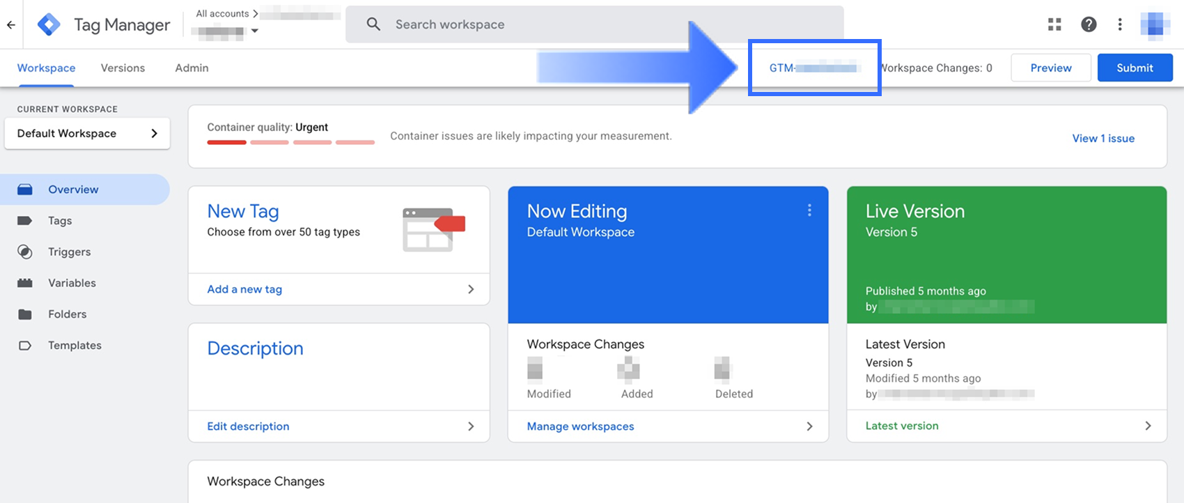 Trong không gian làm việc GTM của bạn, tìm và sao chép ID Container (định dạng: GTM-XXXXXXX) ở góc trên bên phải giao diện.