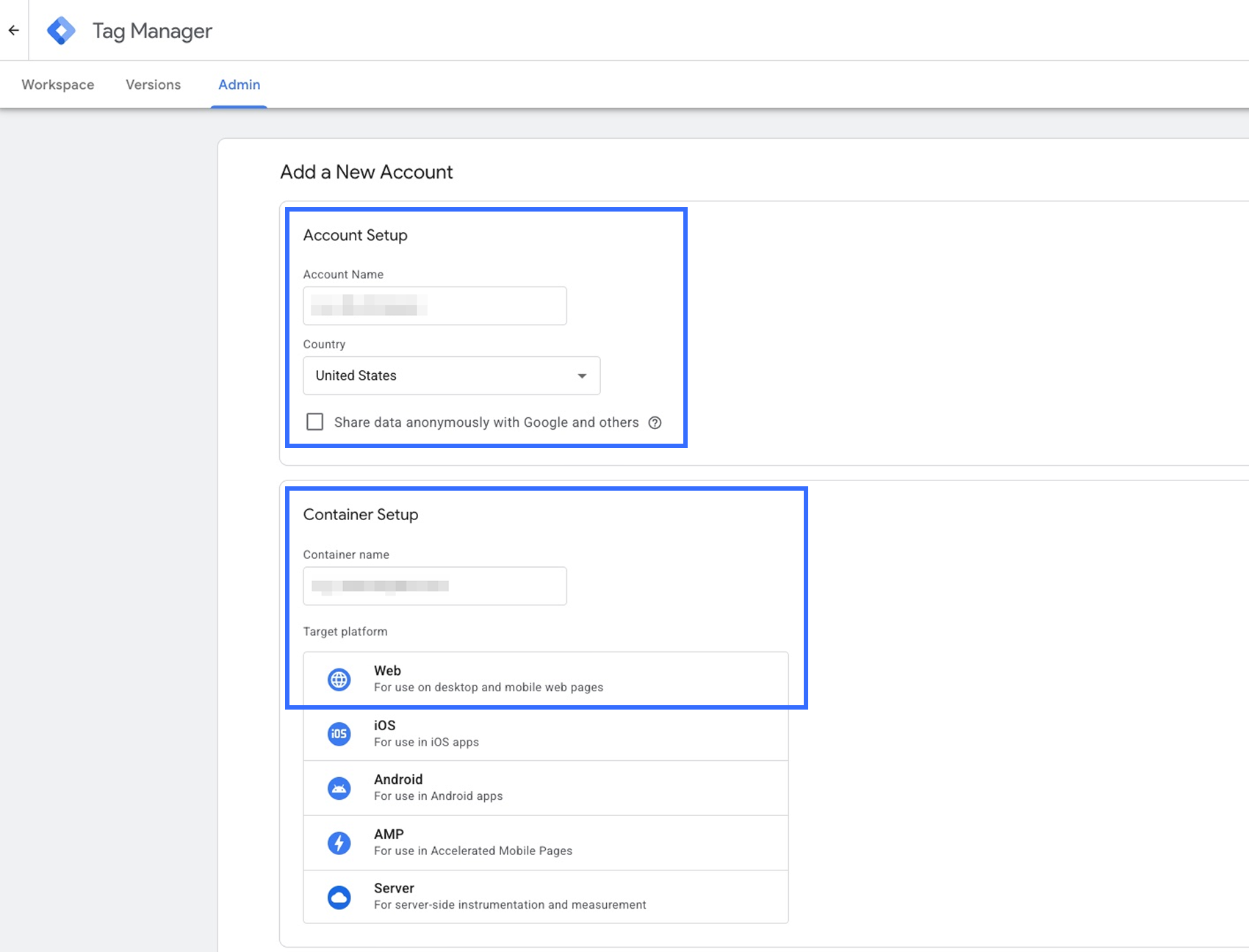 Thực hiện theo các bước dưới đây để tạo tài khoản và container GTM của bạn: