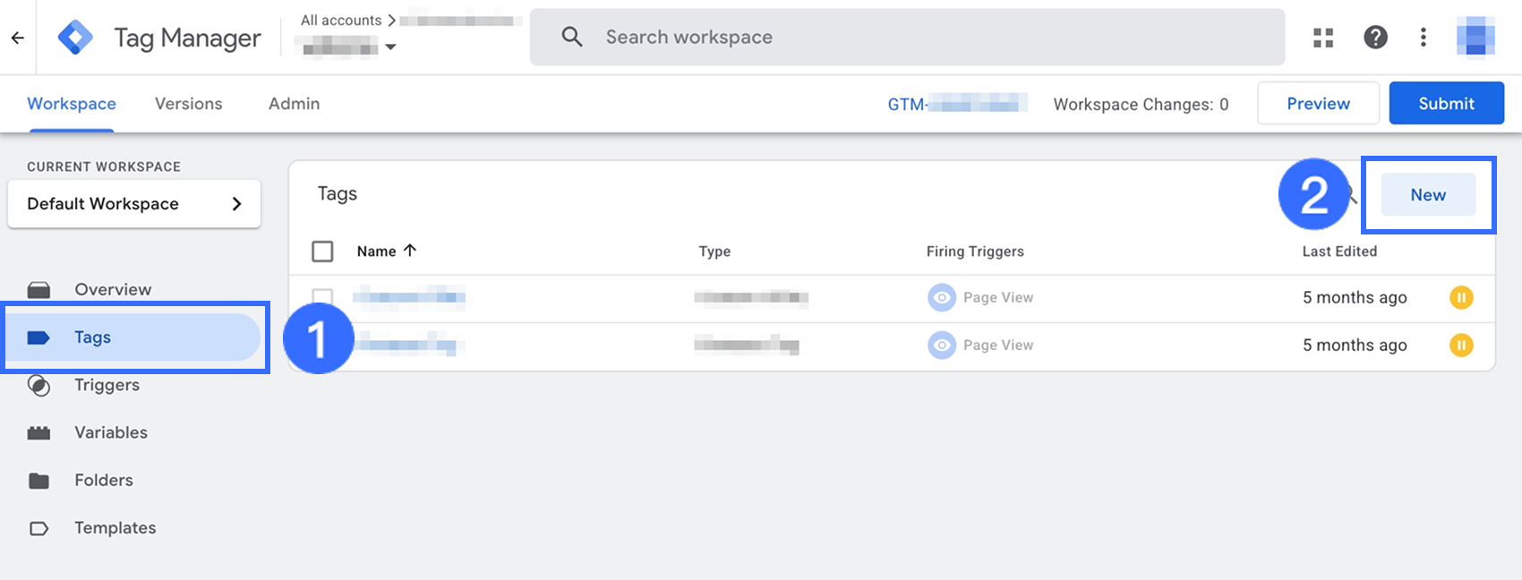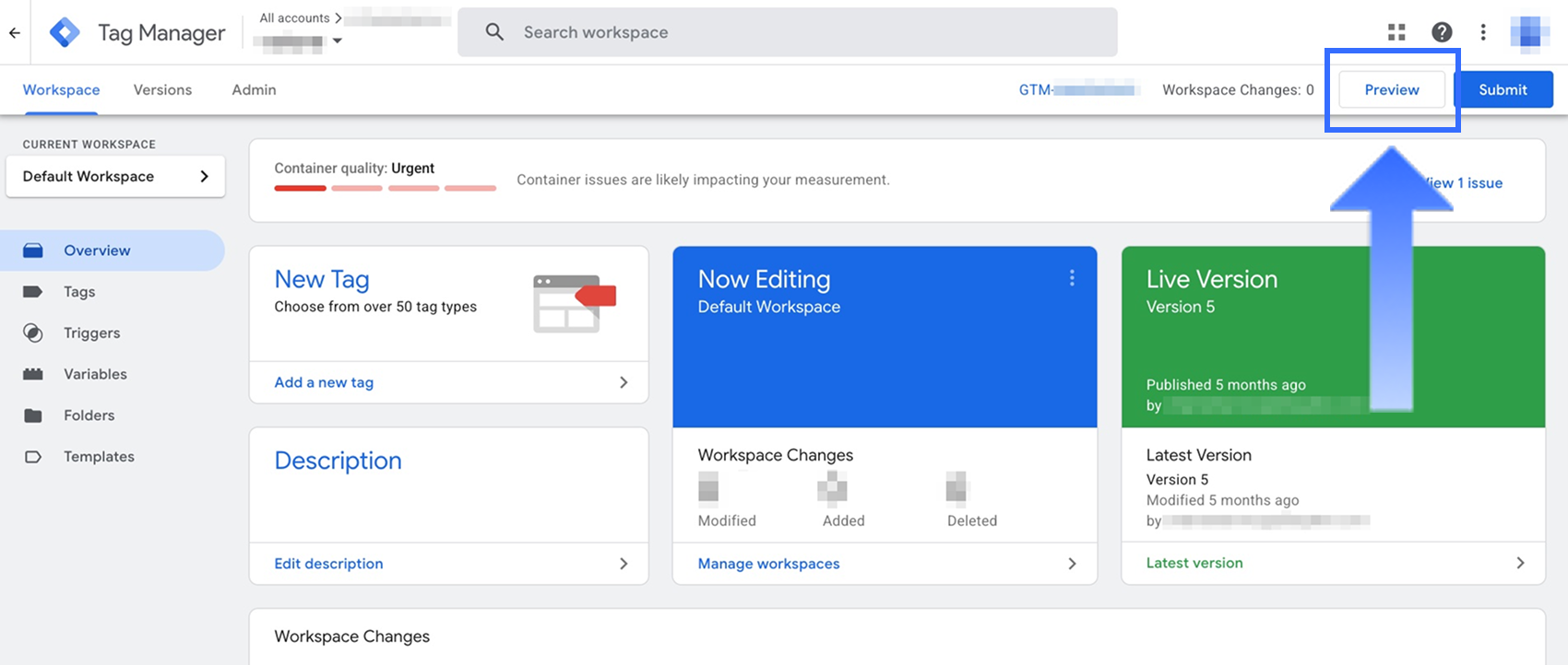 Trong Google Tag Manager, nhấp vào Xem Trước ở góc trên bên phải.