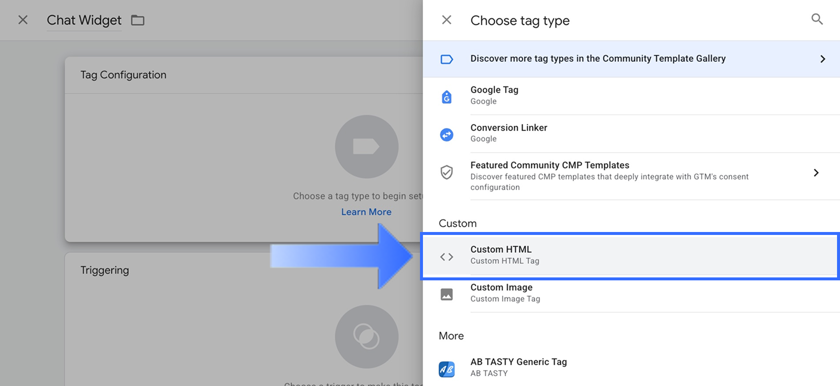 Nếu bạn muốn cài đặt các công cụ bên thứ ba như dịch vụ pop-up, widget chat hoặc các script phân tích bổ sung, bạn có thể thêm chúng qua GTM bằng cách sử dụng thẻ HTML Tùy chỉnh hoặc các mẫu thẻ có sẵn: