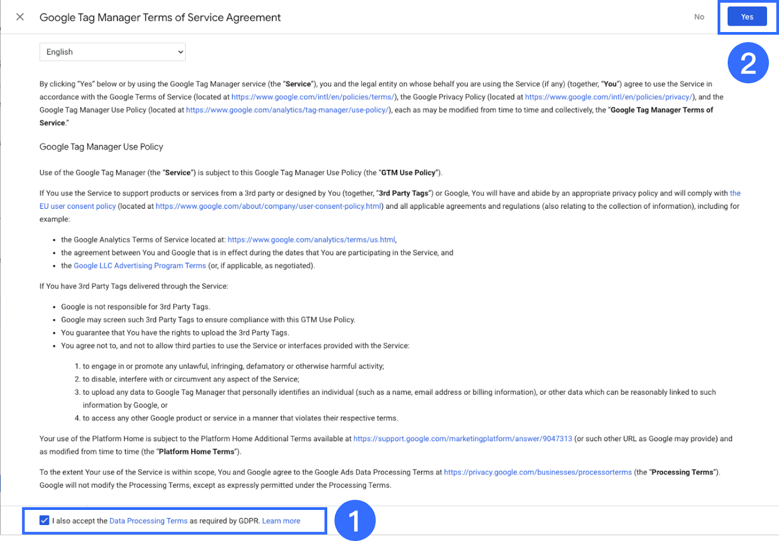- Chấp nhận điều khoản dịch vụ của Google: Nhấp vào ô kiểm trước 'Tôi cũng chấp nhận các điều khoản xử lý dữ liệu theo yêu cầu của GDPR' và nhấp vào Có ở góc trên bên phải.
