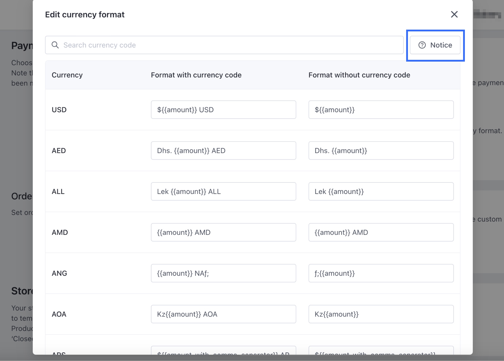Nhấp vào nút Thông báo ở góc trên bên phải của hộp thoại để hiển thị Bảng Tham chiếu Số tiền do SHOPLINE cung cấp. Bạn có thể tham khảo bảng này và thực hiện các sửa đổi theo nhu cầu của mình. Vui lòng lưu ý rằng hiển thị cuối cùng dựa trên định dạng tùy chỉnh mà bạn nhập vào.