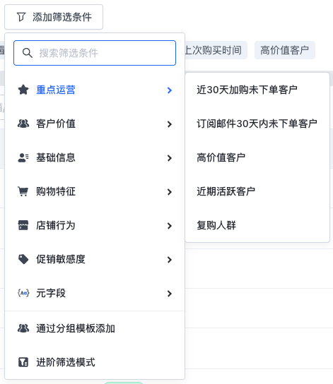您也可以使用细分模版或创建空白细分来筛选客户,并将这些客户加入细分。请点击了解更多。