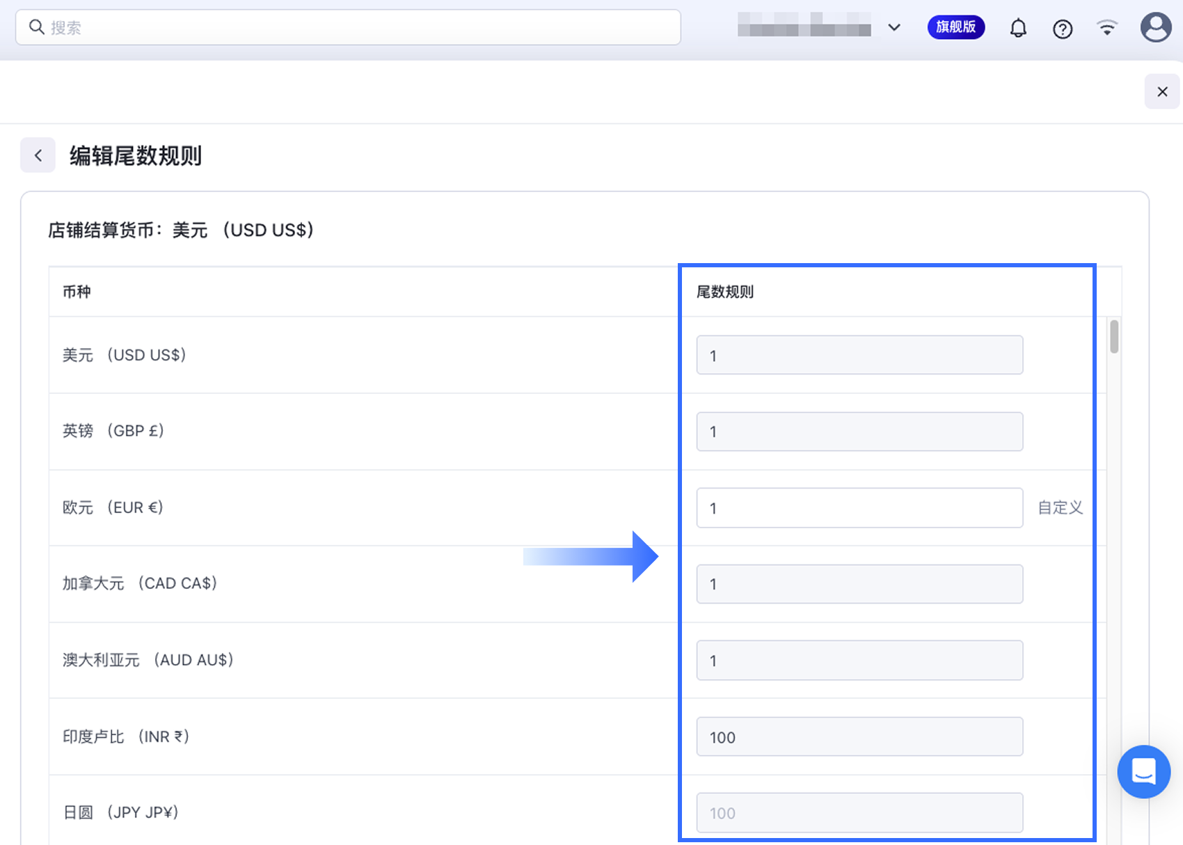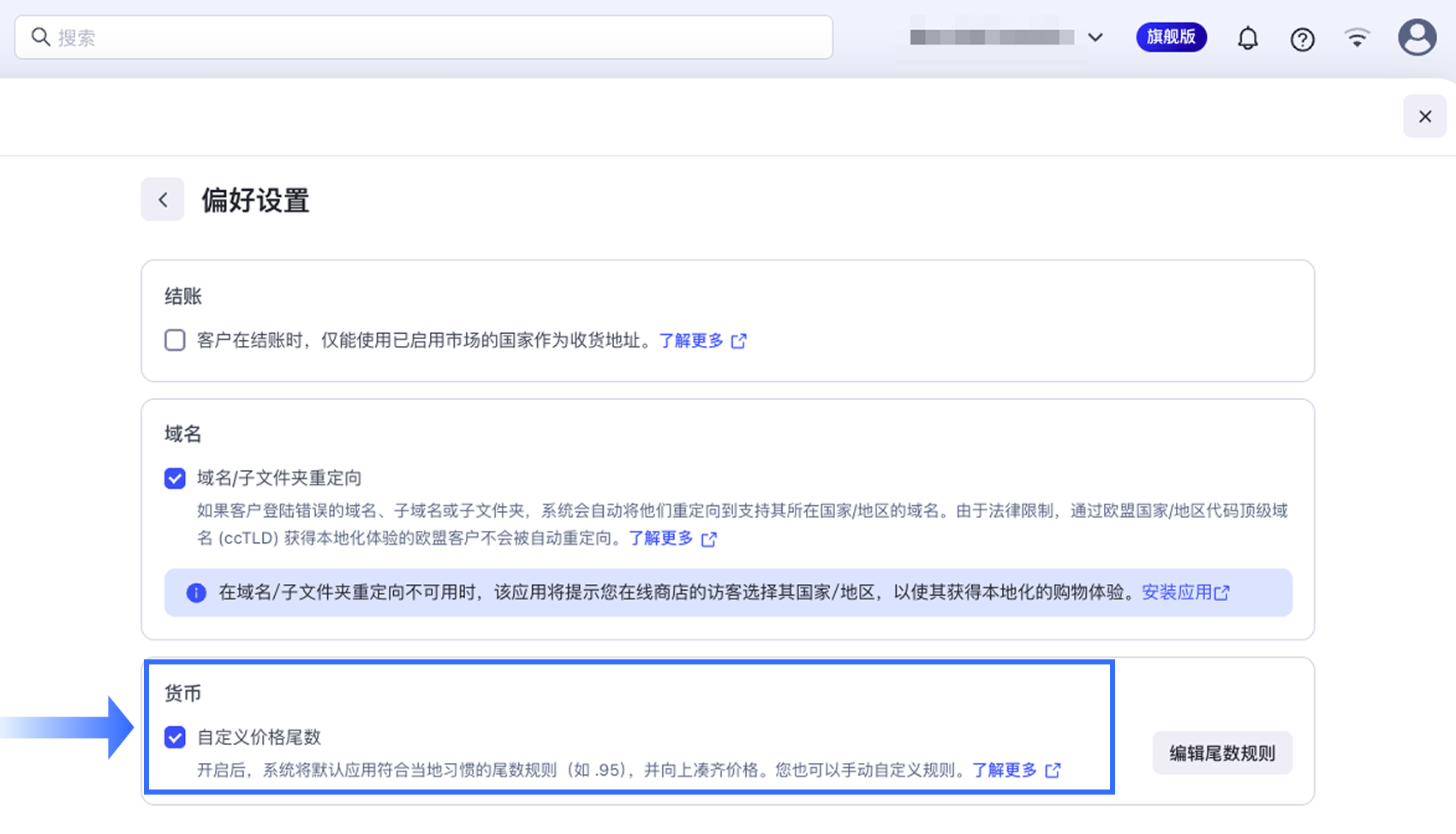 商家可在市场的【偏好设置】中【自定义价格尾数】功能。对于支持自定义的货币,亦可以手动设置尾数规则;不支持自定义的货币将显示为灰色,无法修改。