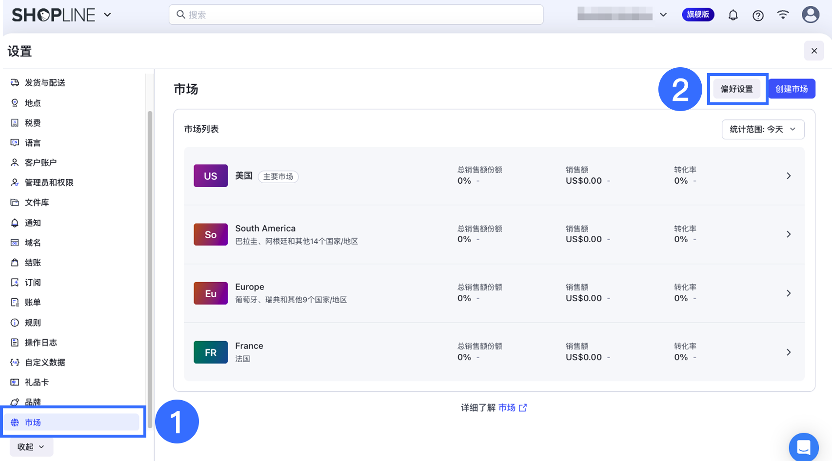 - 在 SHOPLINE 后台中,前往【设置】>【市场】并点击【偏好设置】。