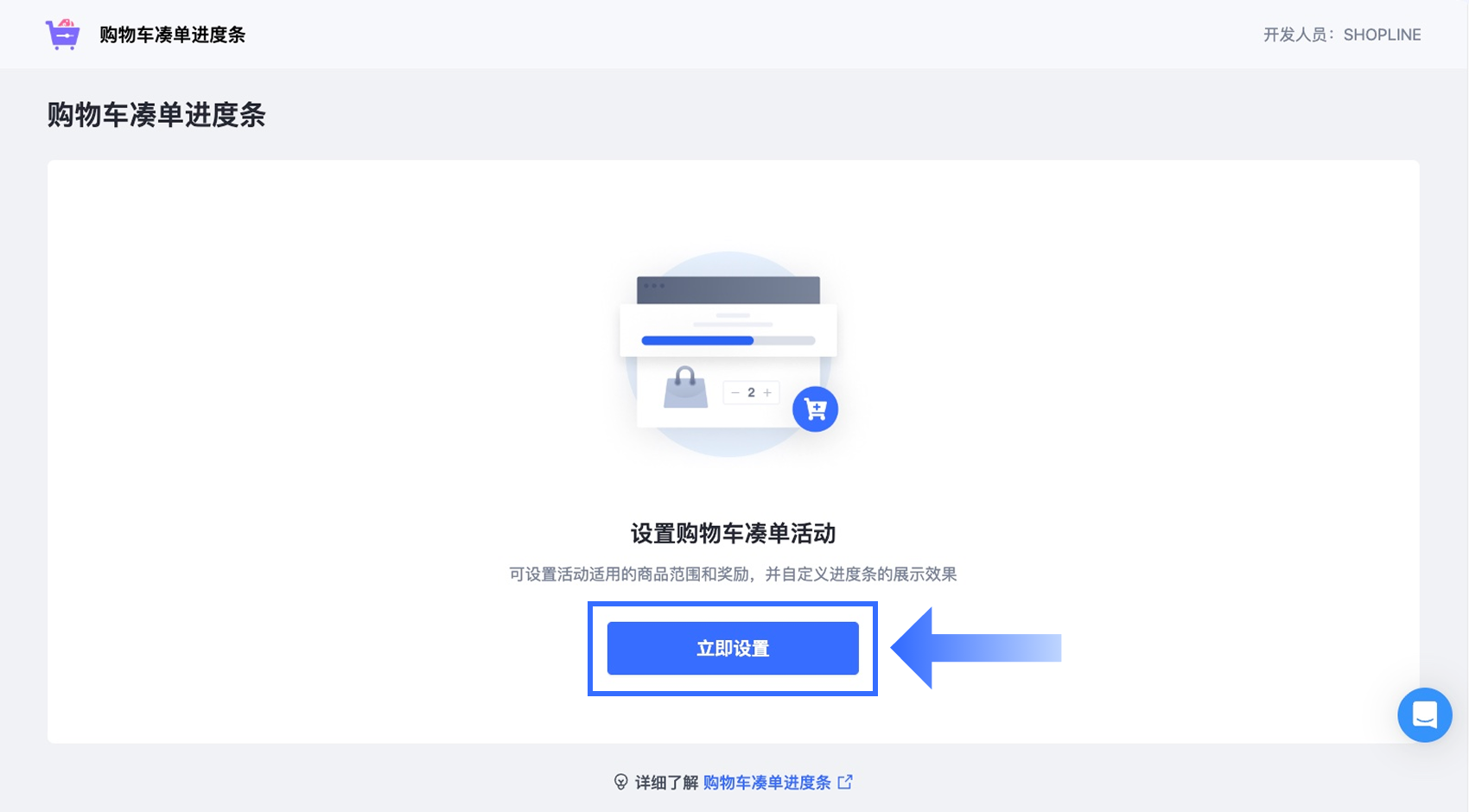 在【购物车凑单进度条】首页,点击【立即设置】按钮,开始创建您的自定义折扣优惠。