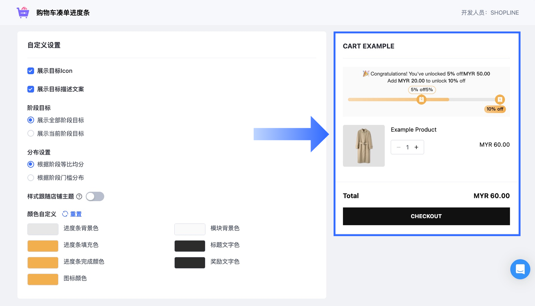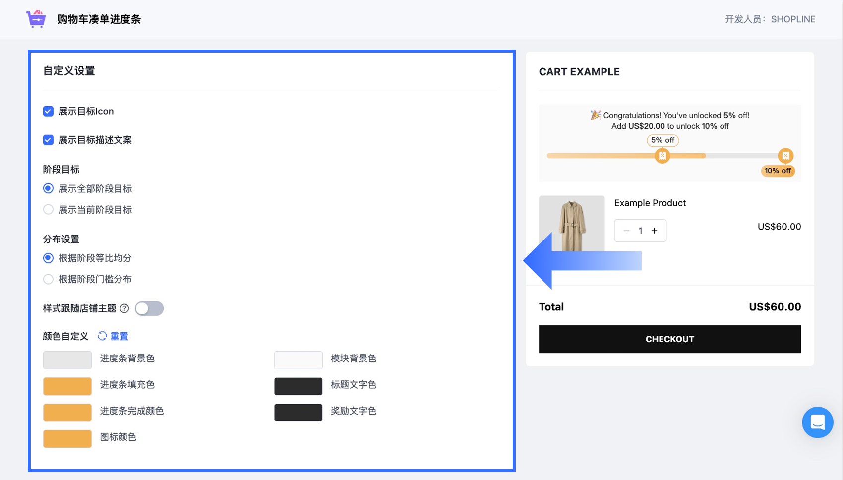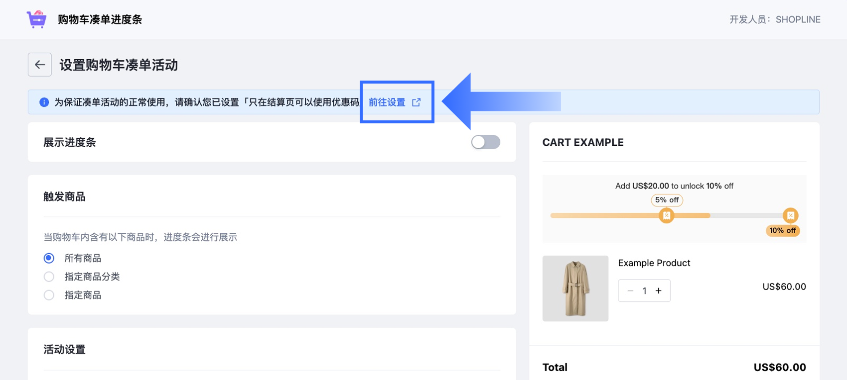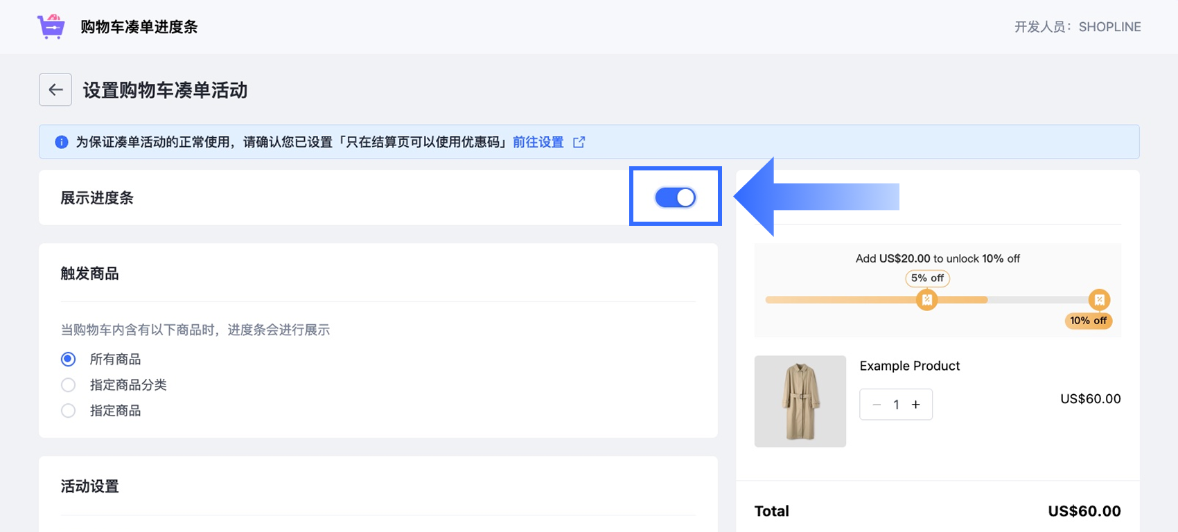 开启【展示进度条】开关,即可在商店的购物车页面显示进度条。