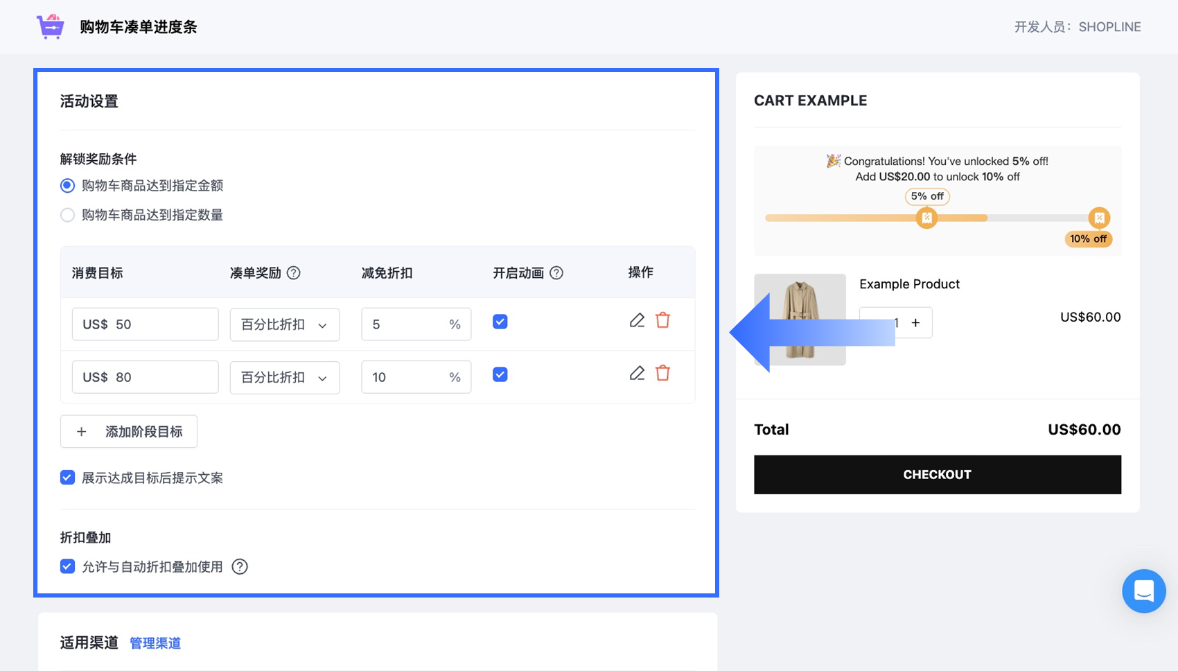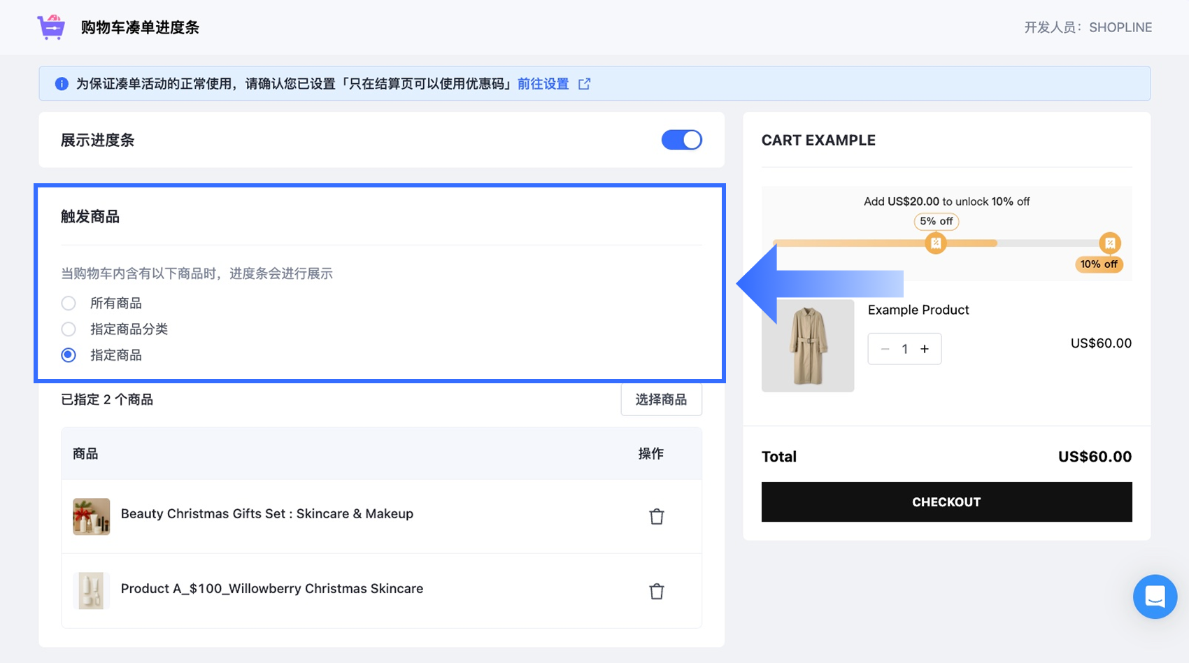 注意: 每个商店在同一时间只能建立一个购物车加购规则。进度条仅会显示在购物车页面,不会显示在结账页面。 -
