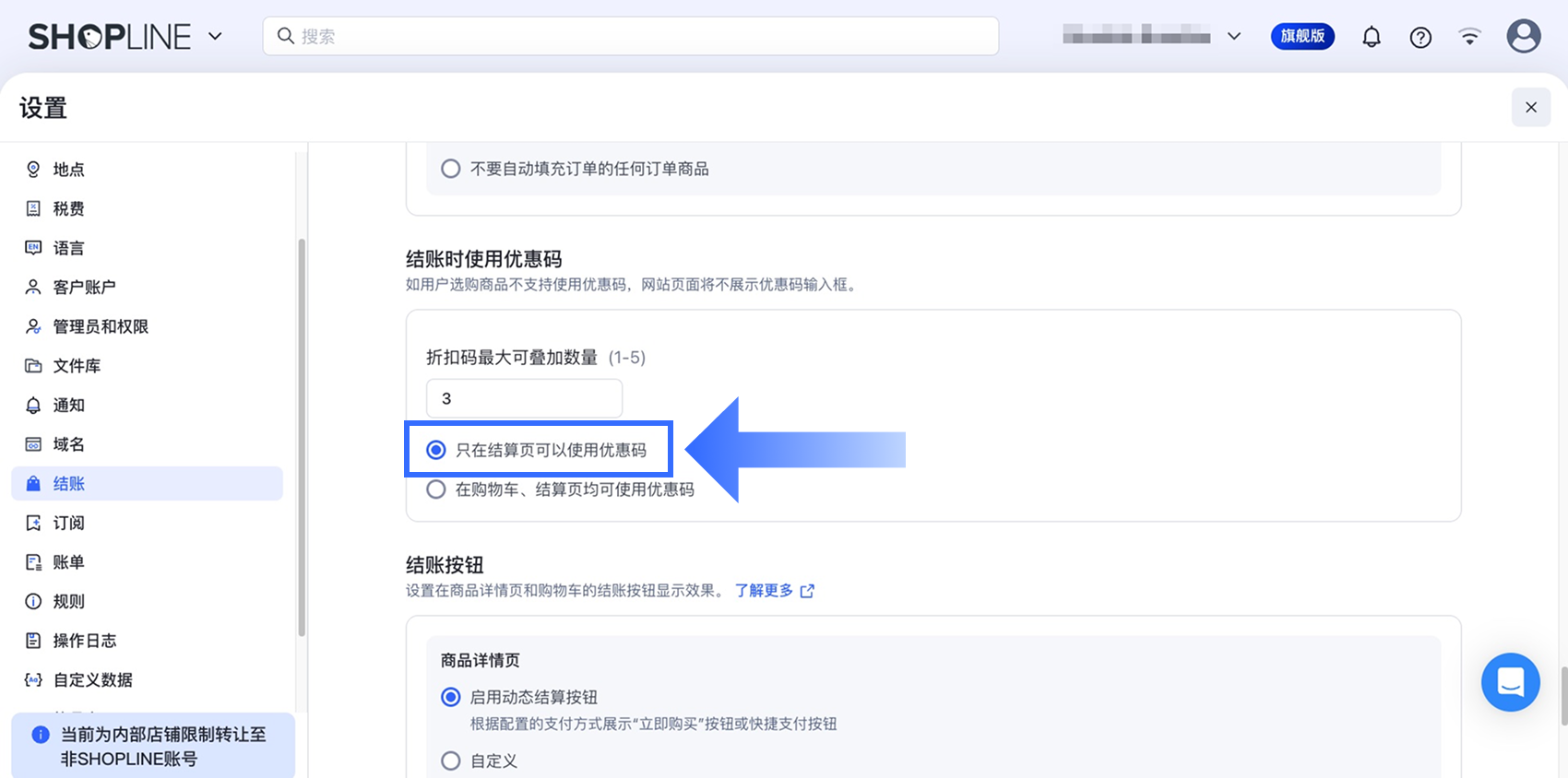 在【结账时使用优惠码】下,选择【只在结算页可以使用优惠码】。