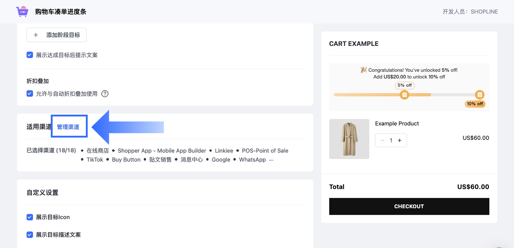 适用渠道: 点击【管理渠道】,选择进度条适用的销售渠道(例如:线上商店或 Shopper App)。