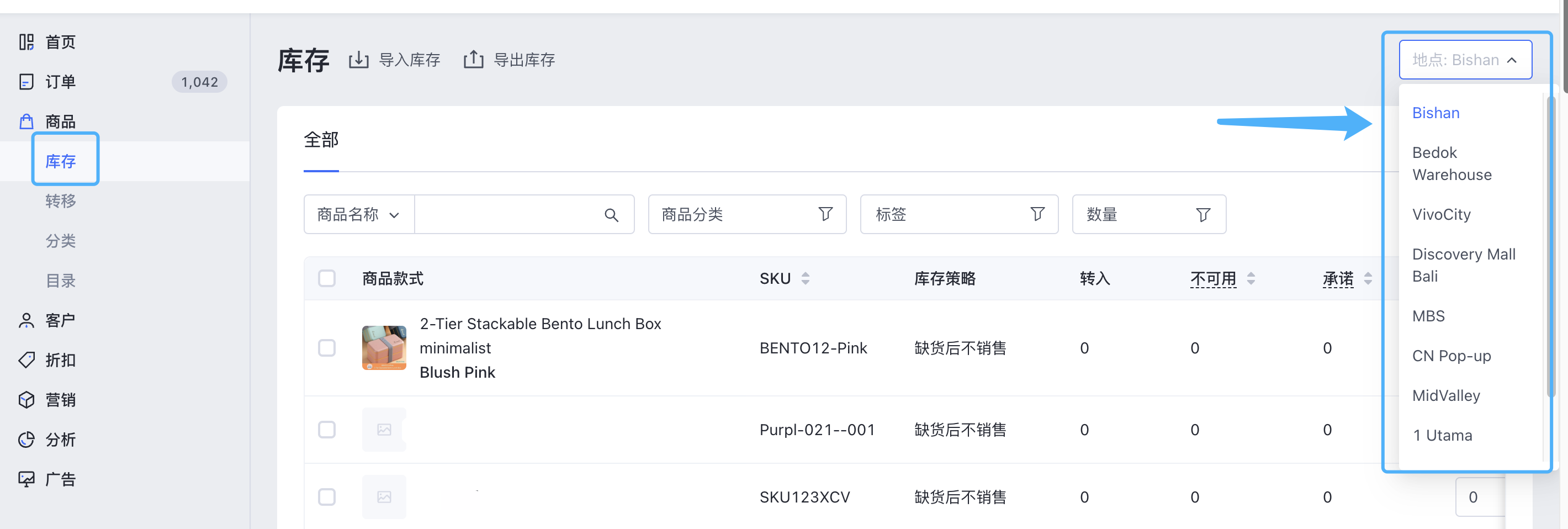 在 SHOPLINE admin ,进入【商品】>【库存】 。