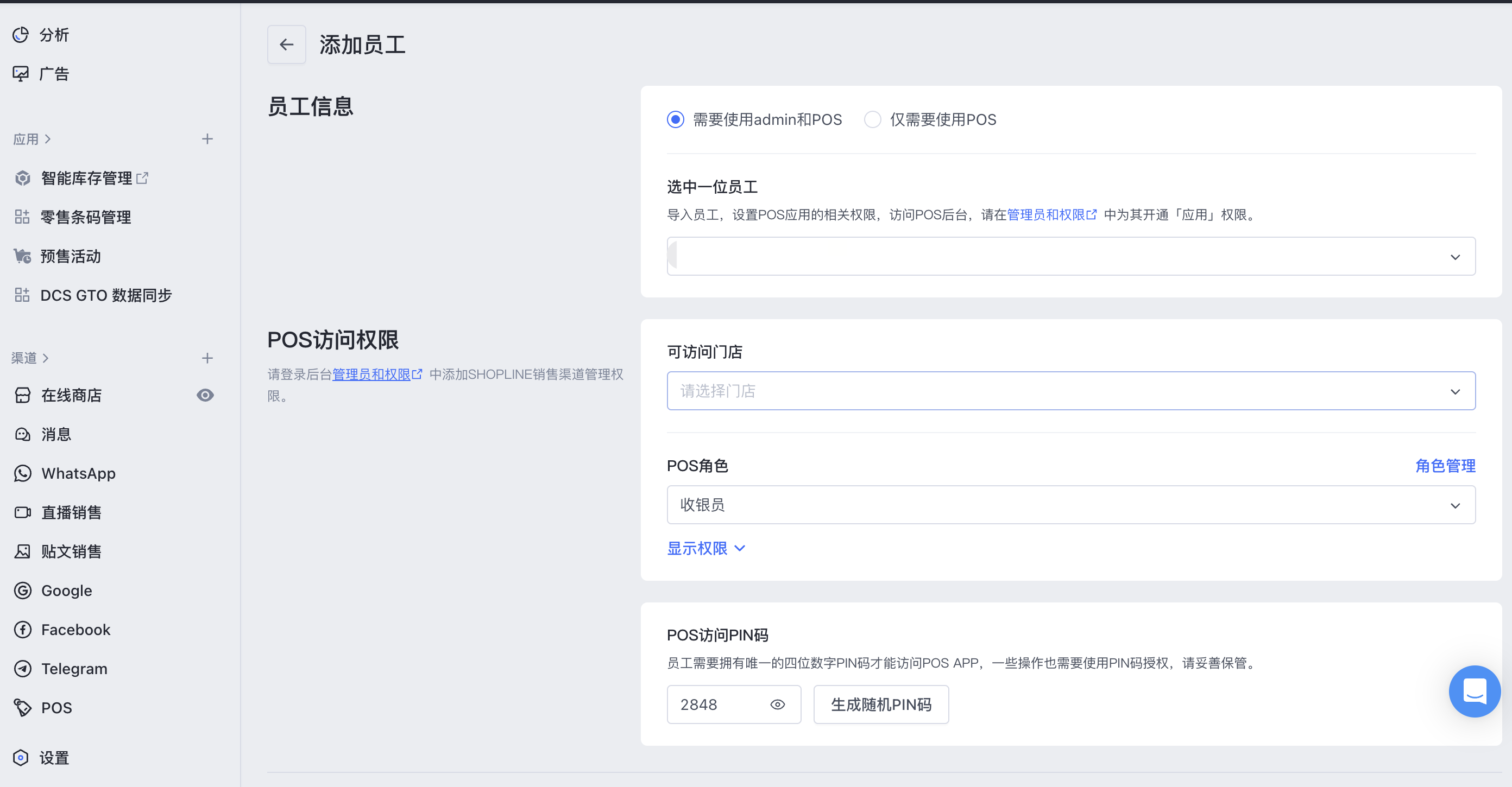 填写员工信息,从下拉列表中选择 POS 角色并生成 POS pin 代码以访问 SHOPLINE POS APP。