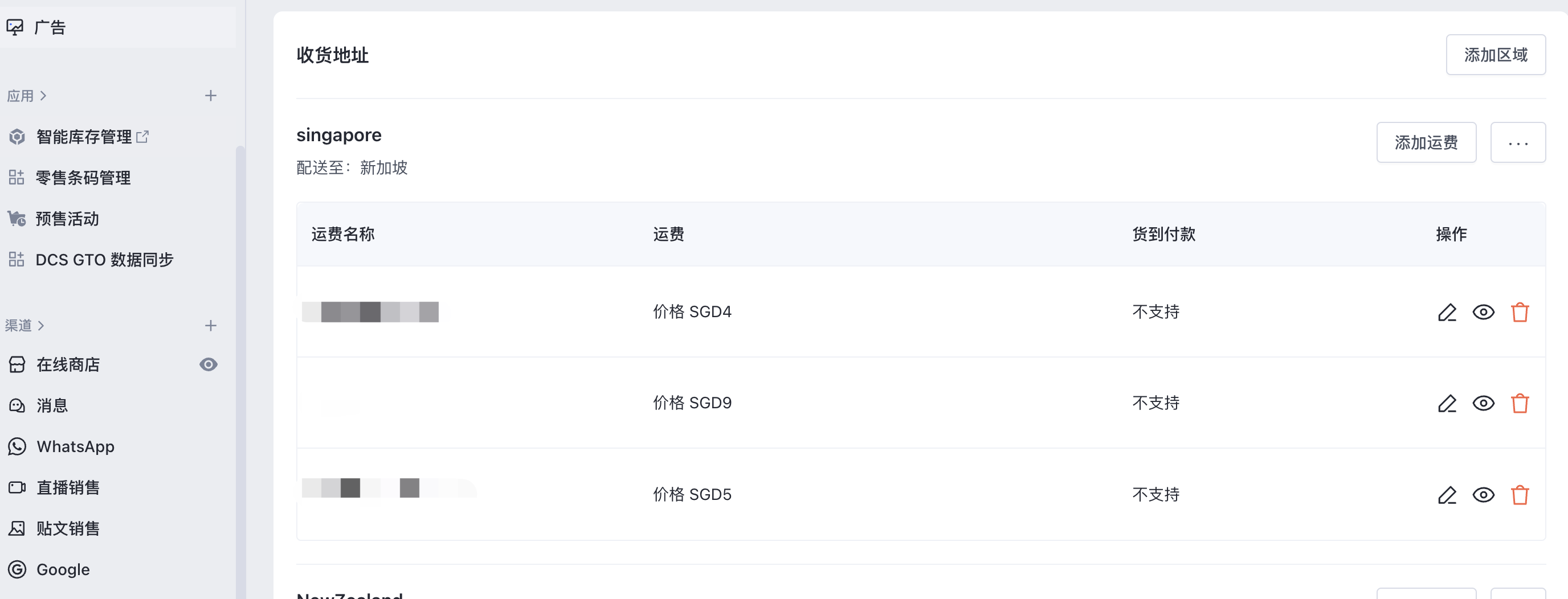 在 SHOPLINE admin ,进入【设置】 > 【发货和配送】>【运费】>【区域和运费】,设置运费生效范围,以便创建配送订单时快速应用运费。详情参阅:POS-创建配送订单。