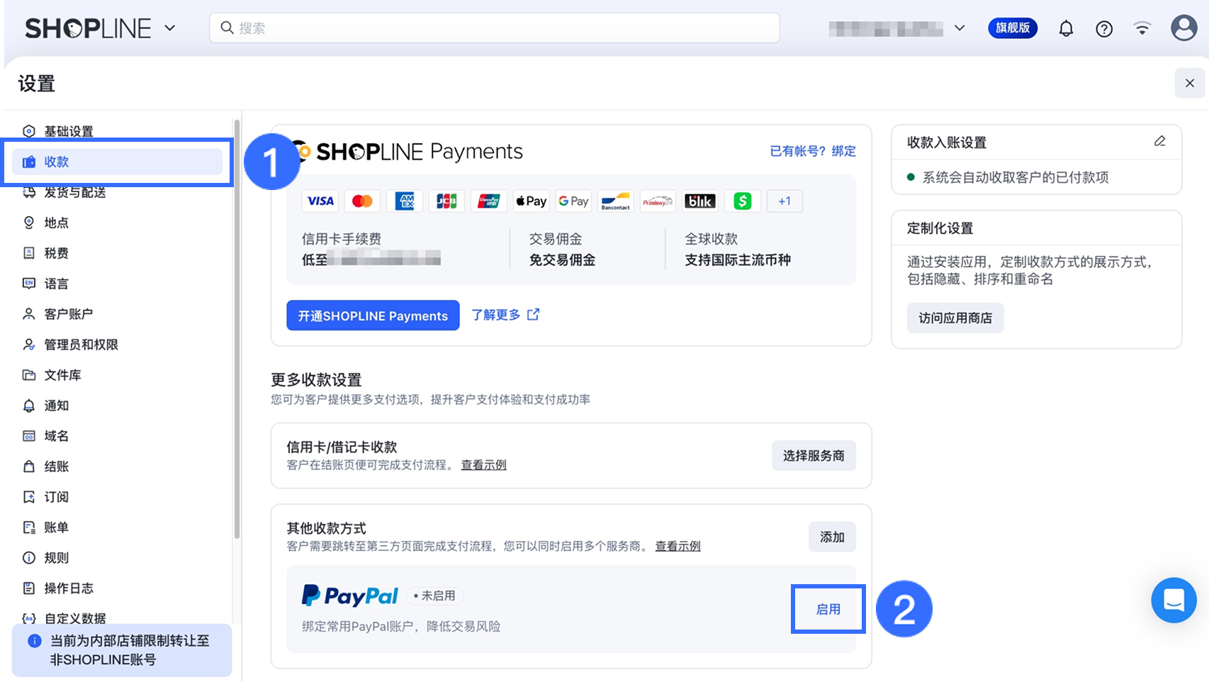 要在 SHOPLINE 中启用 PayPal 作为付款方式,您必须先将 PayPal 账户与 SHOPLINE 后台连接。请按照以下步骤操作: