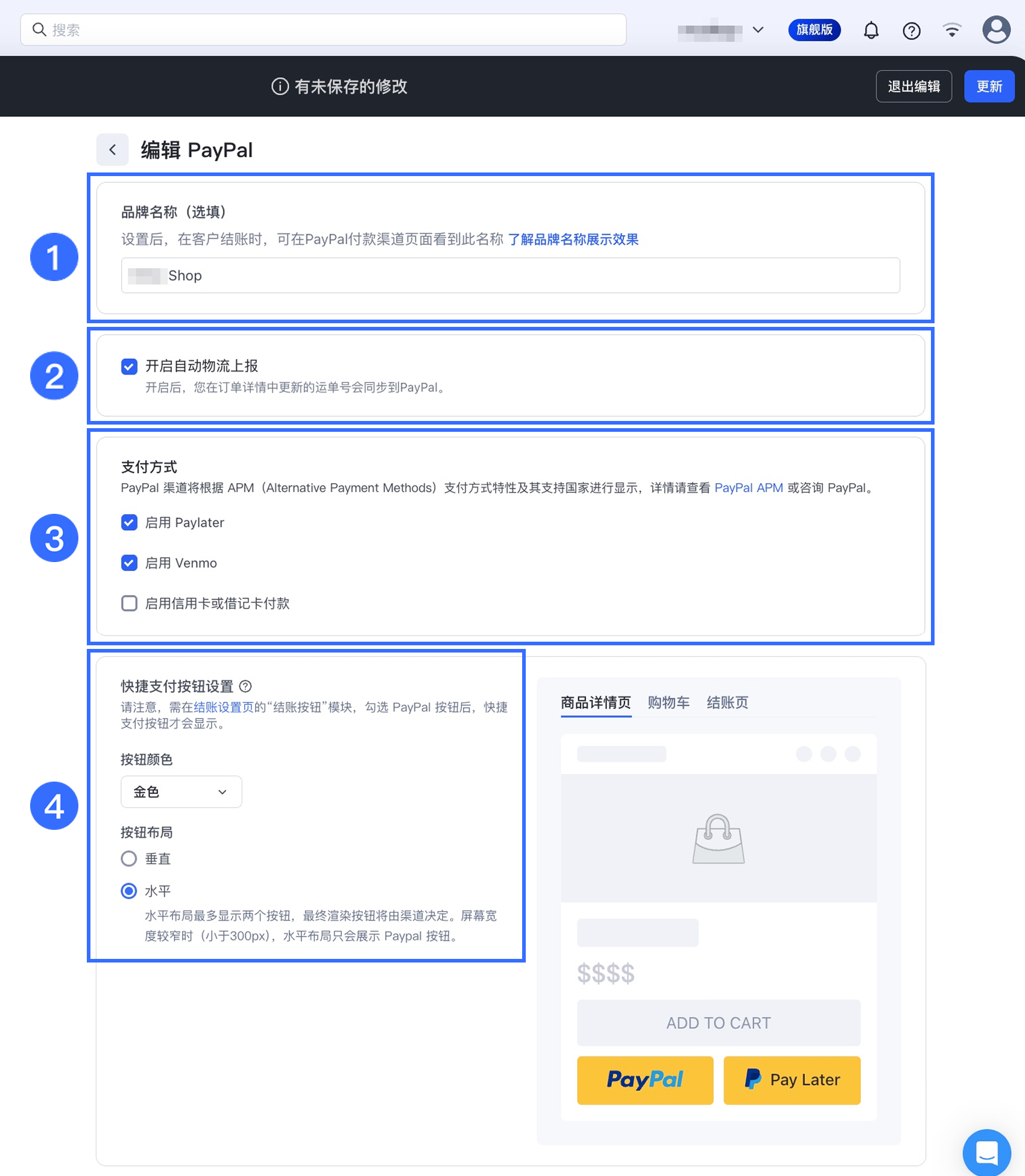成功连接 PayPal 后,您可以进一步自定义 PayPal 及其相关按钮在商店中的展示方式。请按照以下步骤进行设置: