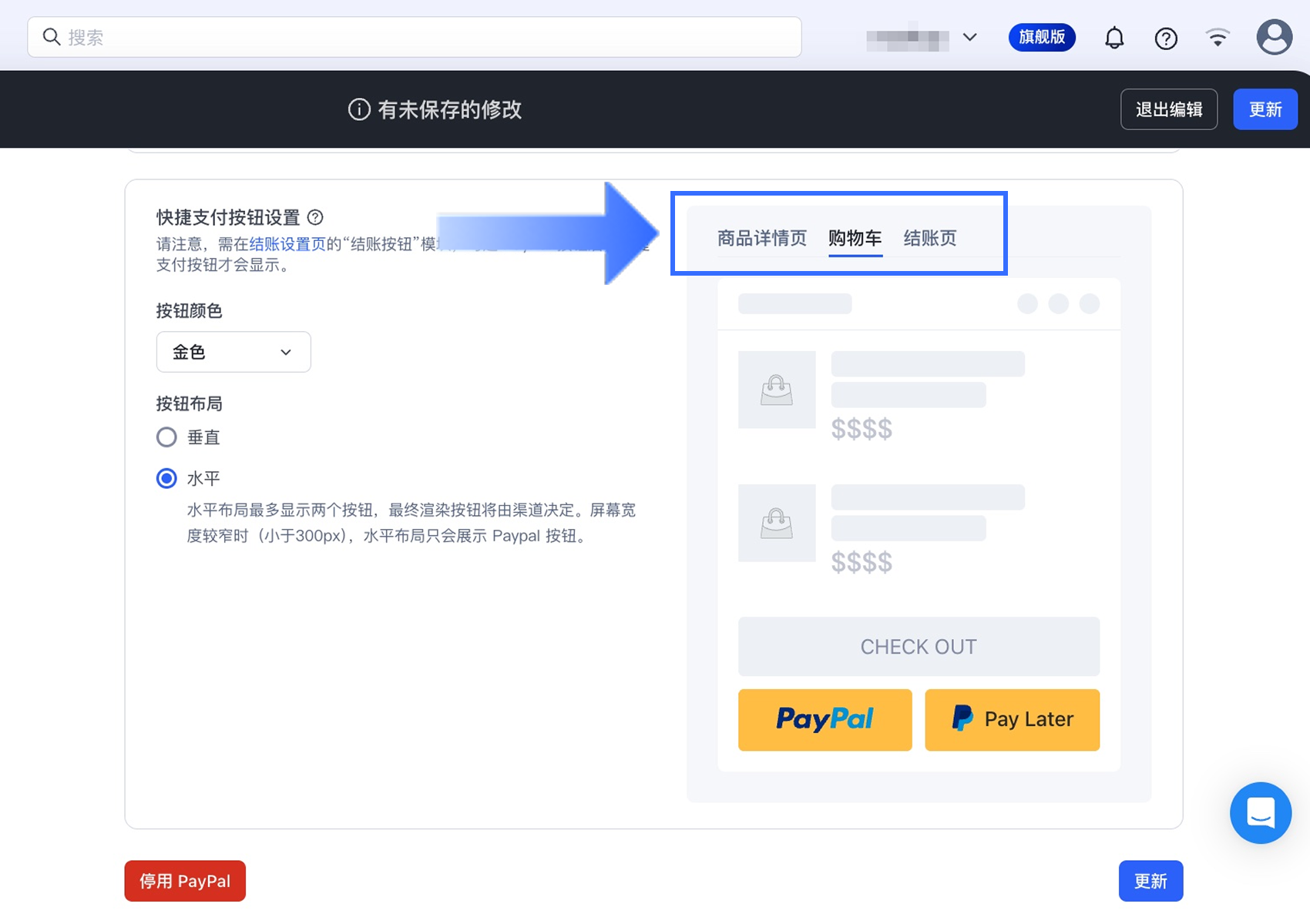 【快捷支付按钮设置】:调整 PayPal 快速结账按钮在您店铺前台的展示样式: