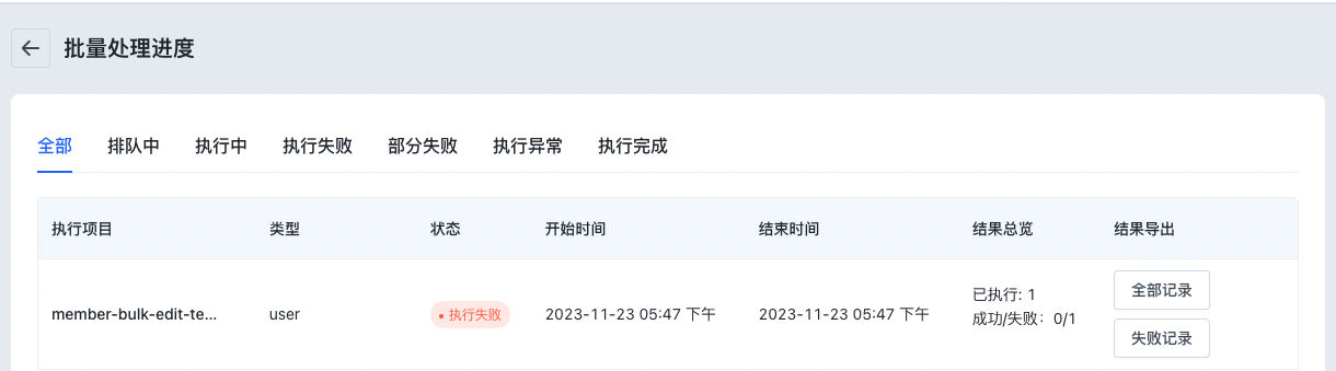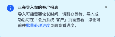 在【批量处理进度】处,您可查看导入的情况。如果存在导入失败的情况,您可点击【失败记录】查看导入失败原因。