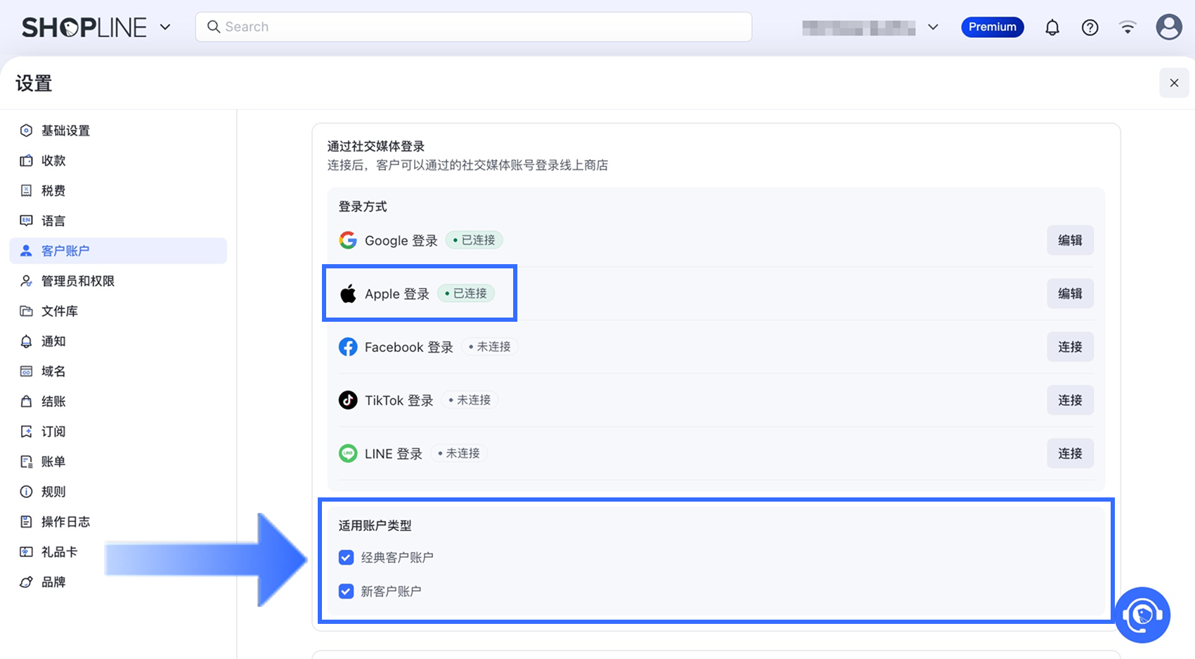 完成后,Apple 登录选项将显示为【已连接】状态。根据您的业务需求,在【适用账户类型】区块中选择是否为【经典客户账户】、【新客户账户】或同时为两者启用第三方登录功能。