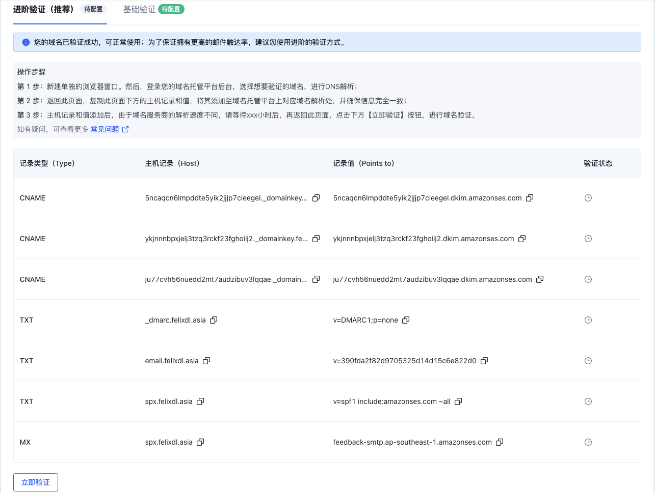 - 完成邮箱一致性验证后,请在Shopline完成域名验证,包含 SPF、DKIM、DMARC(新增要求),点击查看如何验证域名