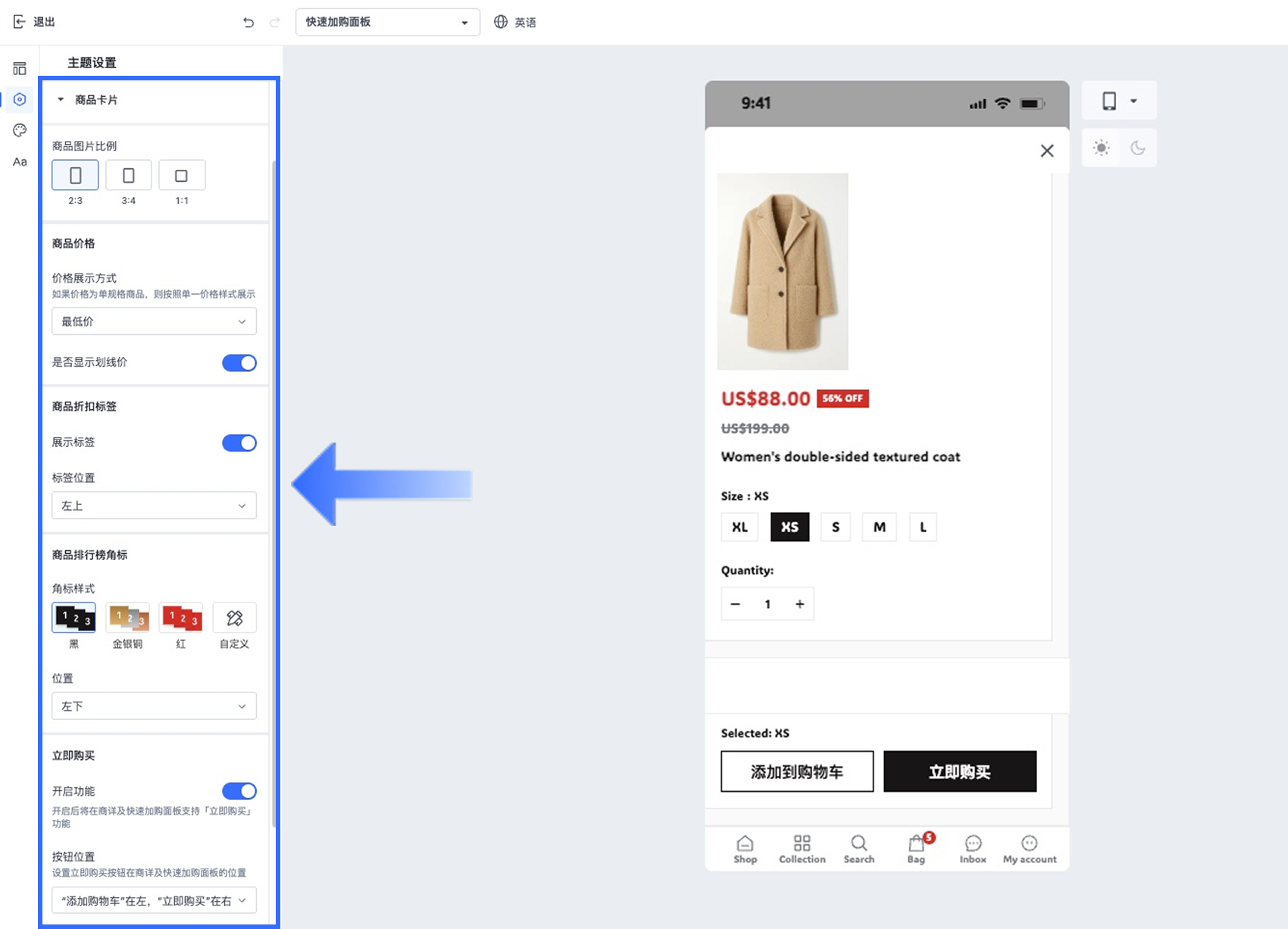 商品卡片可进行商品 图片比例、商品价格展示方式、折扣标签 与 商品排行榜角标 的样式设置,并支持配置 立即购买 功能的展示与按钮顺序,以优化商品详情页及快速加购面板的购买体验。