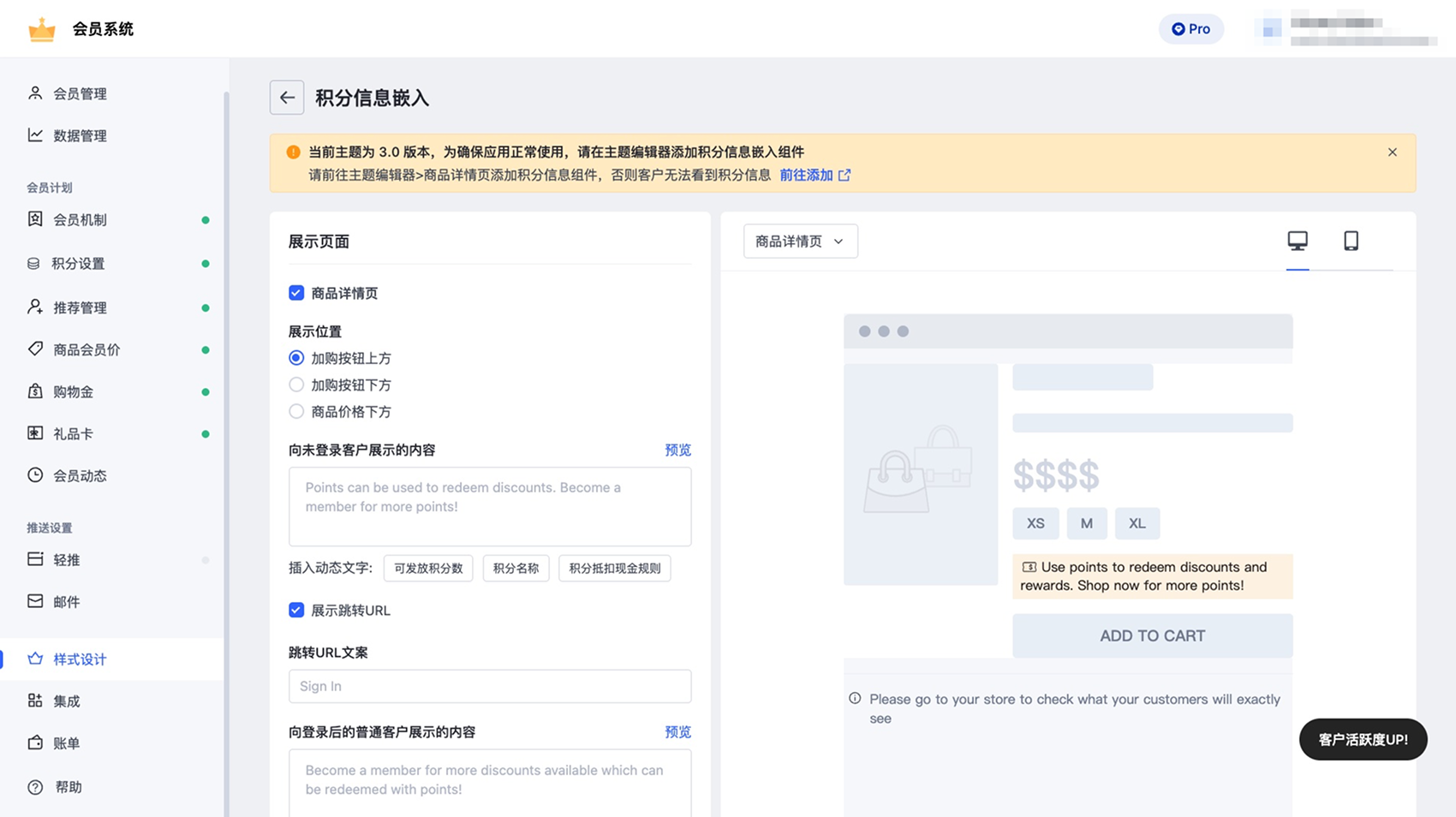 您可以在商品详情页、登录注册页等店铺页面中,通过嵌入会员信息模块,告诉您的客户进行购买或注册时可以获得的积分数、可以优惠的金额、可以获得的会员权益等信息。您可以区分未登录客户、非会员和会员自定义不同文案,也可以自定义信息模块展示的位置。提升您的客户在店铺内的登录注册比例、购物转化和活跃程度。