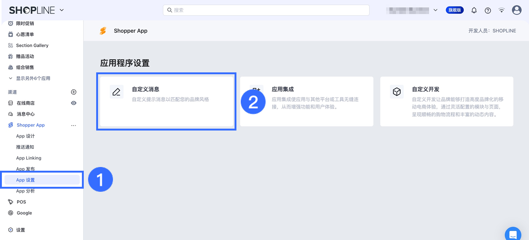 在您的 SHOPLINE 后台中,前往【渠道】>【Shopper App】>【App 设置】,然后点击【自定义消息】。
