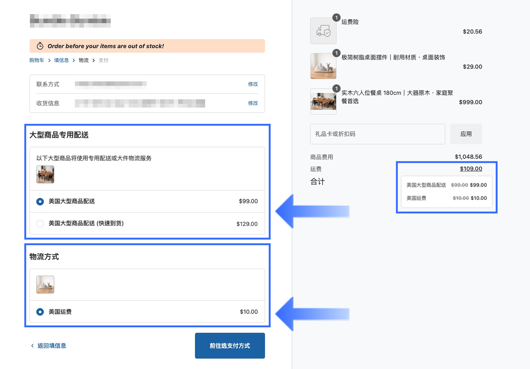 当顾客同时购买大型商品与普通商品时,结账页面会分别显示两个商品分组,顾客需为每个商品组选择对应的运输方式后,再一起完成结账。