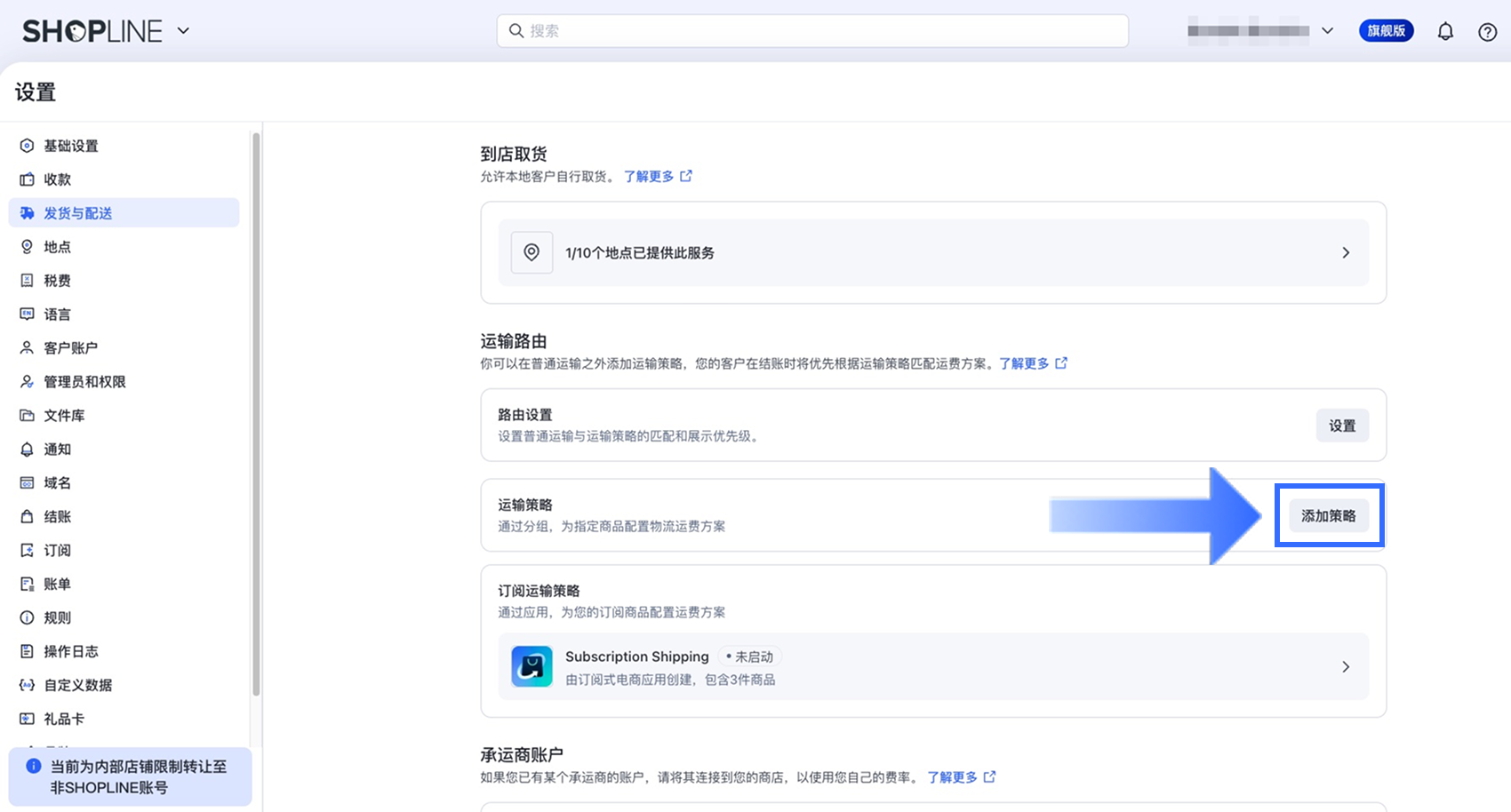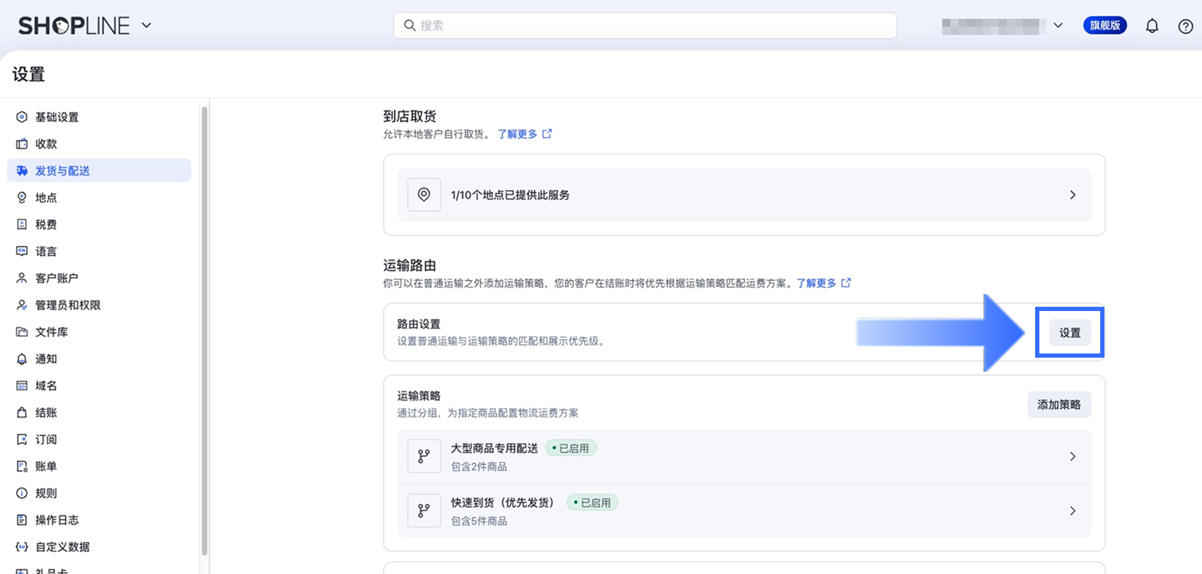 - 在 SHOPLINE Admin 中,前往【设置】>【发货与配送】。