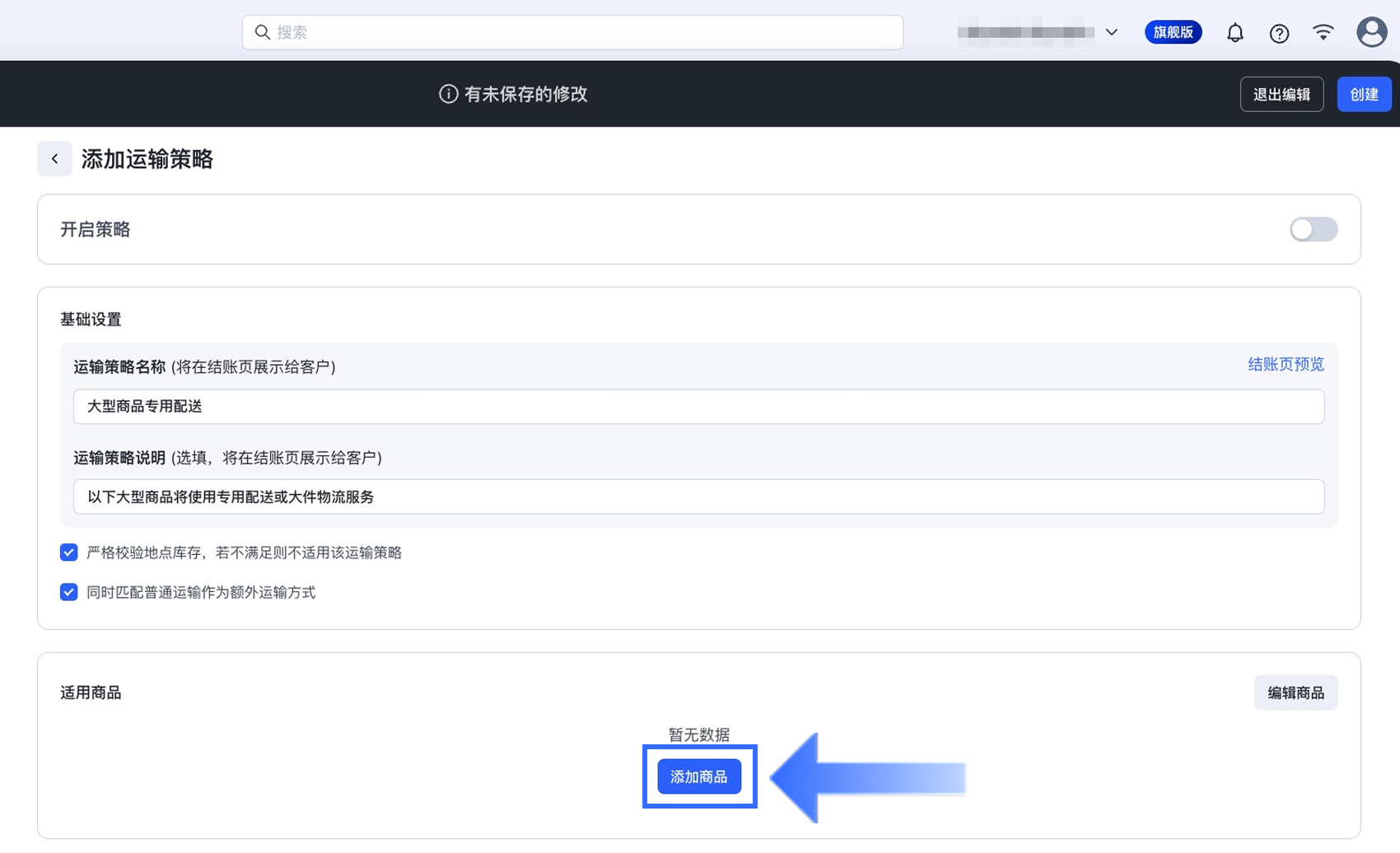适用商品:点击【添加商品】,选择此运输策略适用的商品。