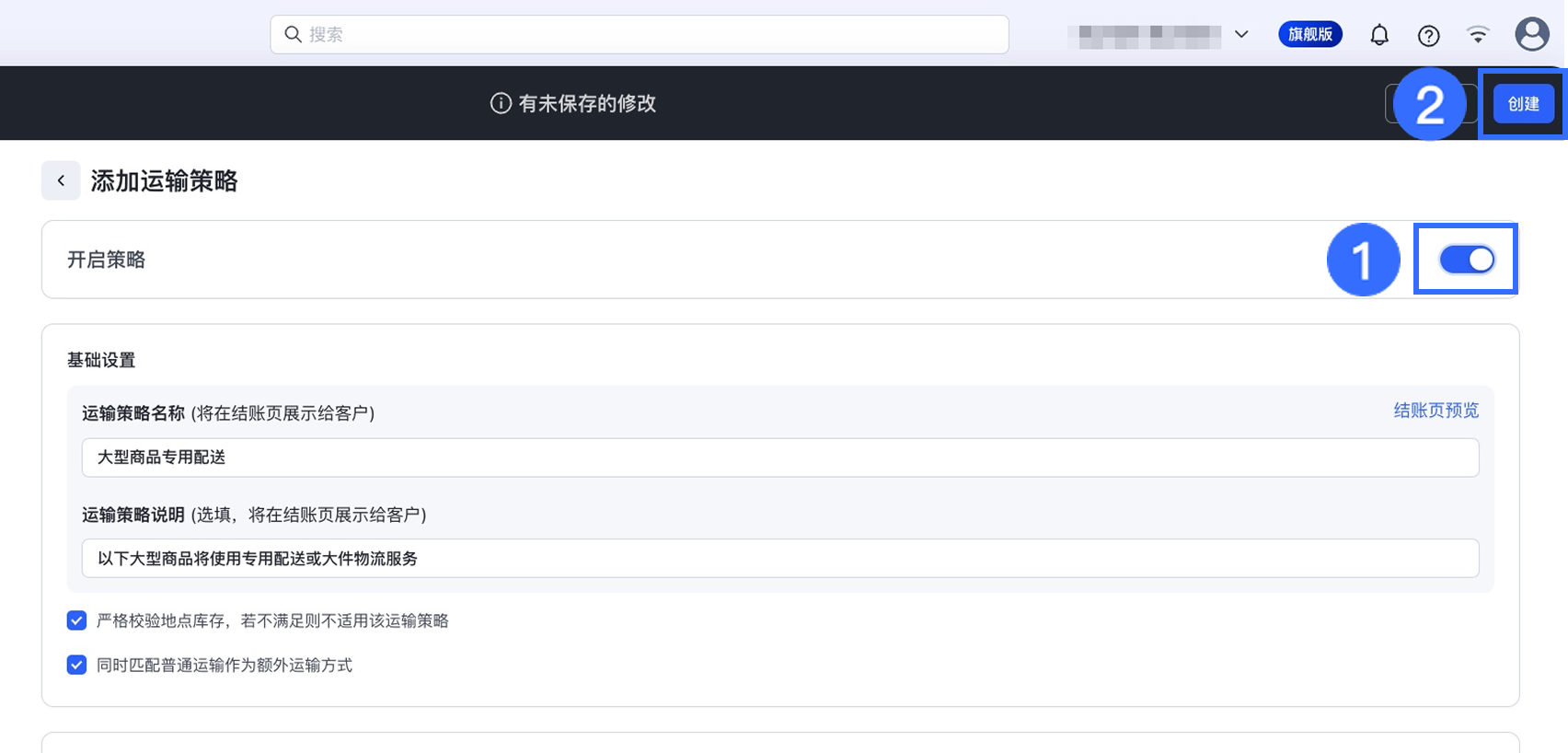 启用运输策略,并点击【创建】以保存设置。