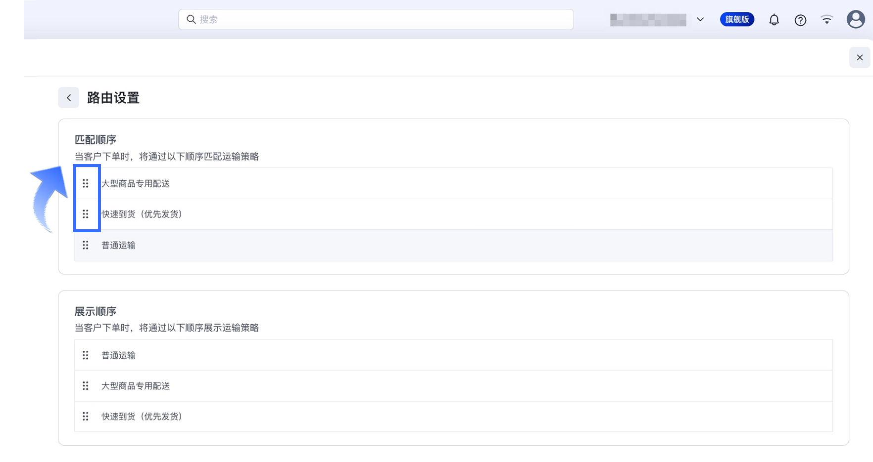 运输策略将按照创建时间顺序进行匹配,越早创建的策略优先级越高。【普通运输】始终固定在最后,作为兜底选项。如需调整匹配顺序,请按照以下步骤操作: