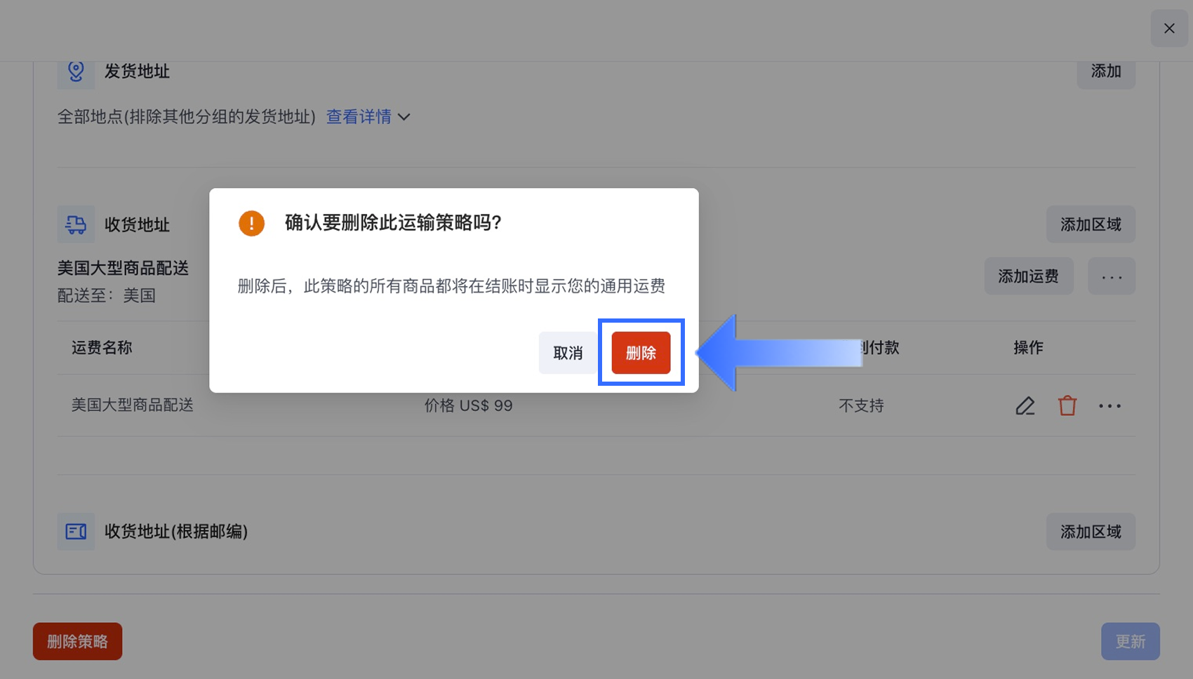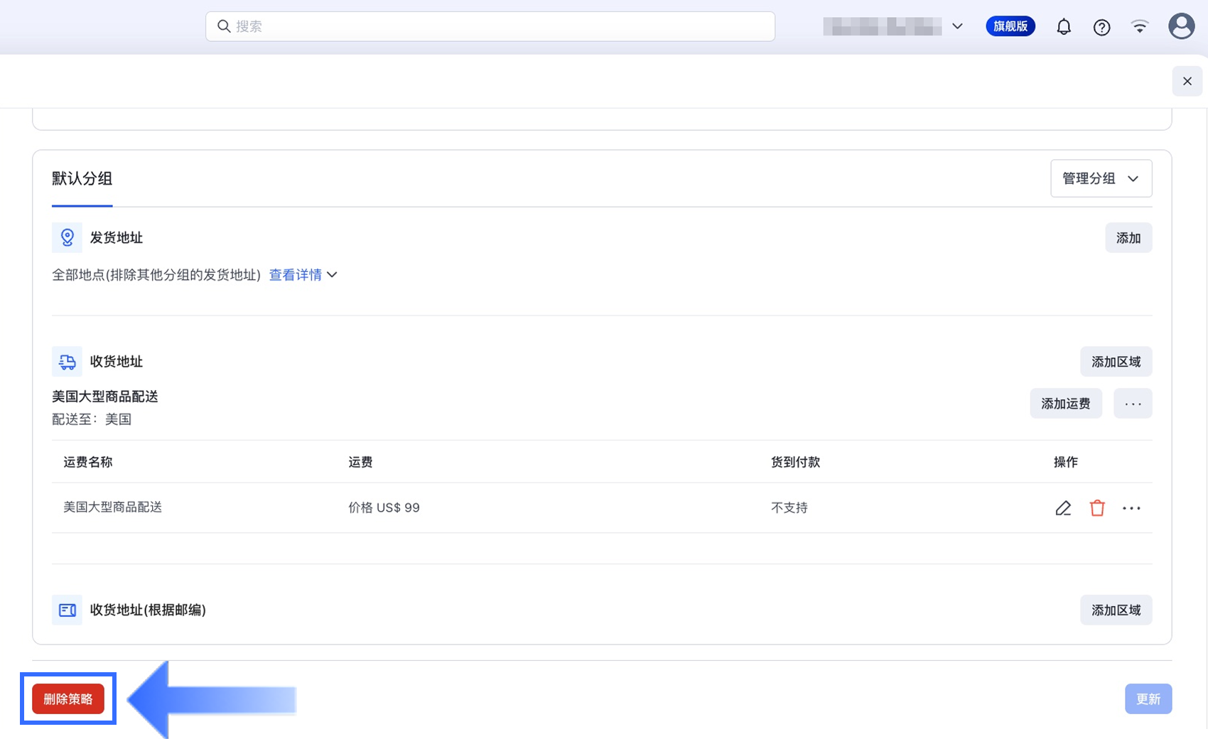 在【运输策略】部分,找到并点击需要删除的策略。