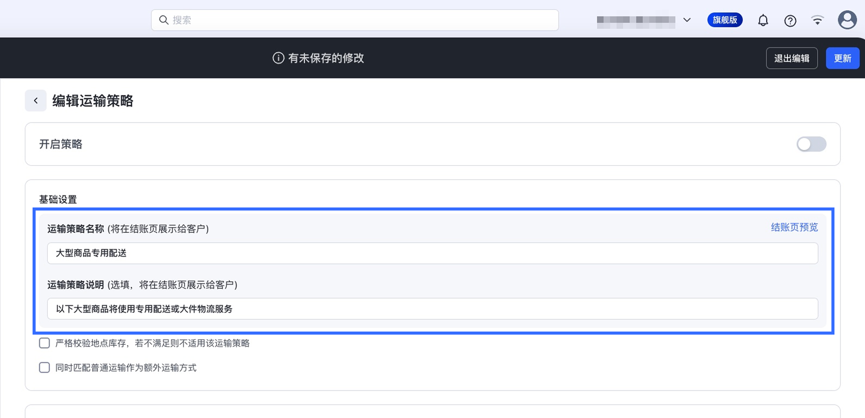您可以修改已创建的运输策略,但由第三方应用创建的运输策略无法在此处编辑。