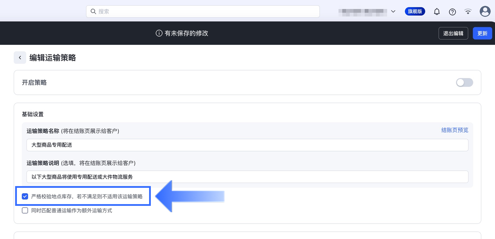 严格校验地点库存,若不满足则不适用该运输策略:启用此选项后,系统将校验对应发货地点的库存可用性。若商品库存不足,则该运输策略不会被应用。
